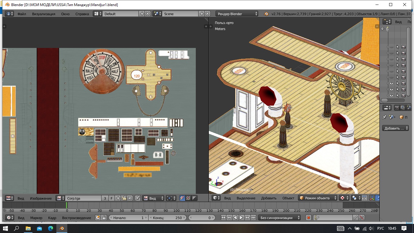 Пришлось переделать скин. Захватил часть борта ниже ватерлинии, для её нормальной прорисовки. Добавил мелочевки: компасы, машинный телеграф, разнообразных лючков и тамбуров. Добавил три мачты, но позже, ориентируясь на фото и схемы поздних модернизаций лодок, первую и последнюю убрал. Работаем дальше.