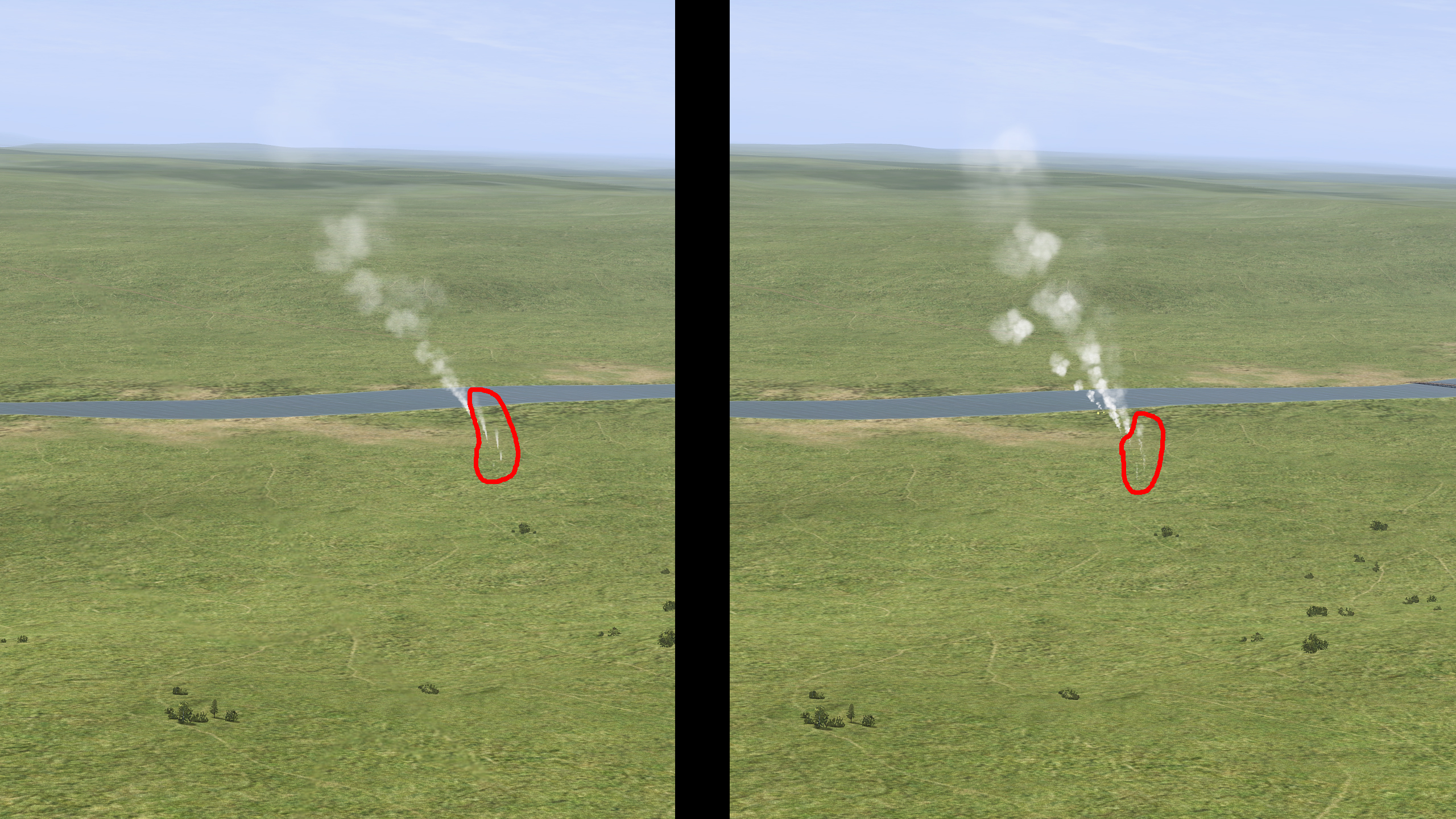 В "конце пути" трассера с 3D дымком, у дымка был заметный "расширяющийся хвост" - скрины 1, 2 слева, который ну очень не по мне, но в старом году подправить уже не было моральнофизических сил, а в новом уже нашёл вариант исправления - скрины 1, 2 справа. Чуть подправил текстурку и с одним пулемётом дымослед смотрится нормально, а вот когда два 12мм и + 20мм скрин 3 (с кабиной и без), то дымка то многовато, ну и как всегда поищу варианты, чего бы урезать. Теперь по дыму ракет и делал на РС82, а на других пока не смотрел... На скрине 4: слева - дефаултый дымослед, середина - в Звукотрассерах, справа - уже новогодний вариант. В новом дымоследе убрал "лишнее" в ефф-ках, заменил текстуру дыма, сделал заметный мерцающий выхлоп огня - пока оставил. |