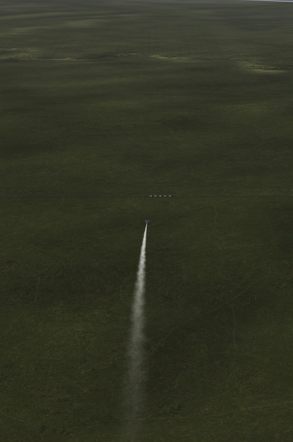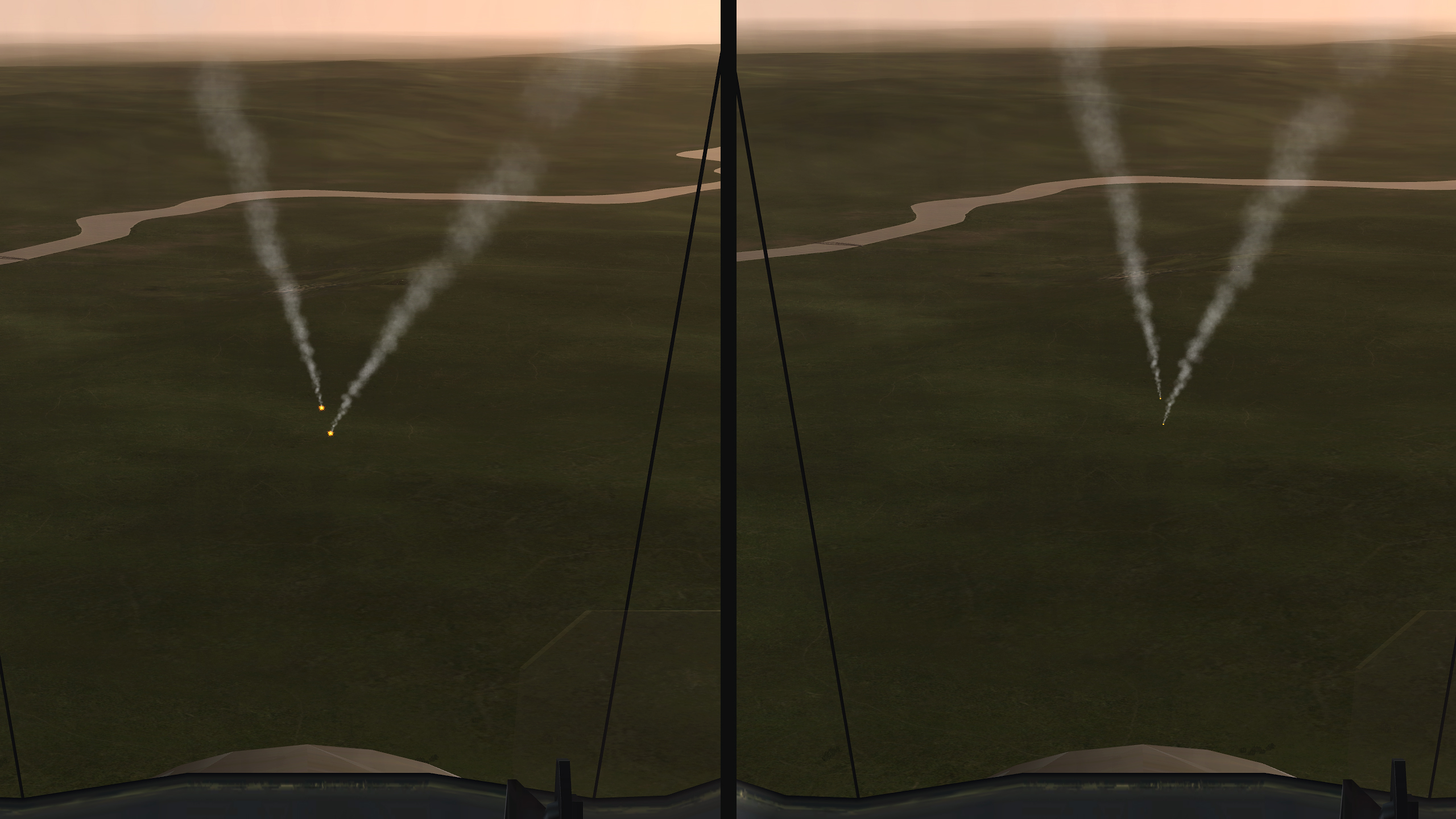 А ракета R4M в дефаулте преподнесла сюрприз: оказывается в полёте образуются искры скрин 1, но уверен (очень смелое заявление), что их никто никогда не видел, а для показа их, увеличил время жизни, уменьшил прозрачность, выбрал вечер. На скрине 2 дефаултый дымослед, а на скрине 3 мой вариант - уменьшил дымослед, а вместо невидимых искр добавил мерцающий выхлоп.