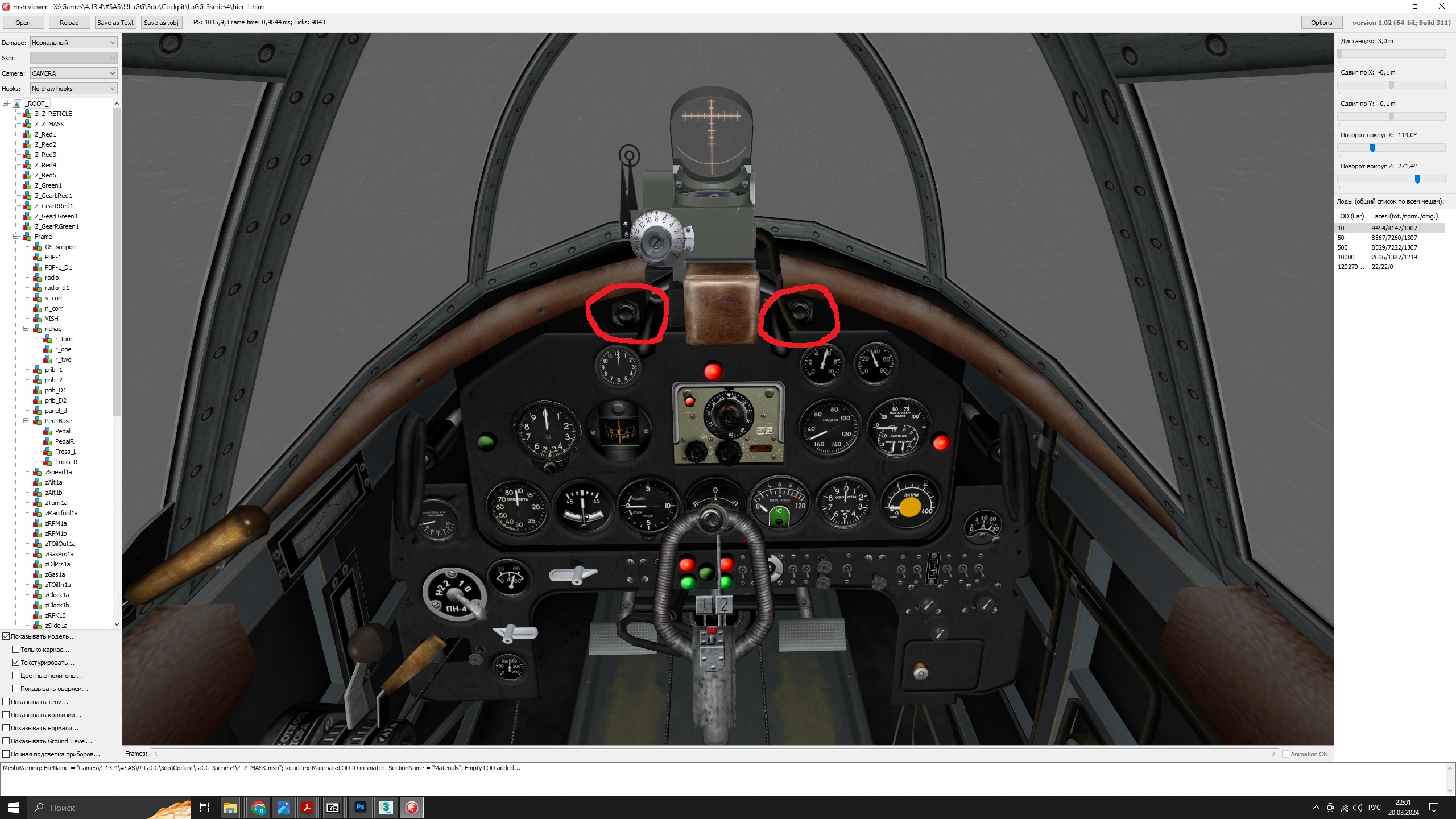 Скрин 3. В БзС тоже крупная перфорация, ориентировался на них. В Руководстве к Ла-5ФН перфорация как в чистой игре. Пока трогать не буду, оставлю как есть. МГ могли тоже срисовать из этой книги. В книге могли быть некоторые художественные отклонения. Скрины 4,5 Надо поправить маппинг. Скрин 5 У Ла-5ФН в руководстве эта кнопка тоже есть. Контактная кнопка сигнализации шасси. Насчёт винтика. Возможно, стоит попробовать поиграть с текстурой, там идёт крепление приборной доски. Скрин 6 Исправлю, глаз уже "замылился". Скрин 7 Возможно, БЖСЭ. Скрин 8 Приподниму. |