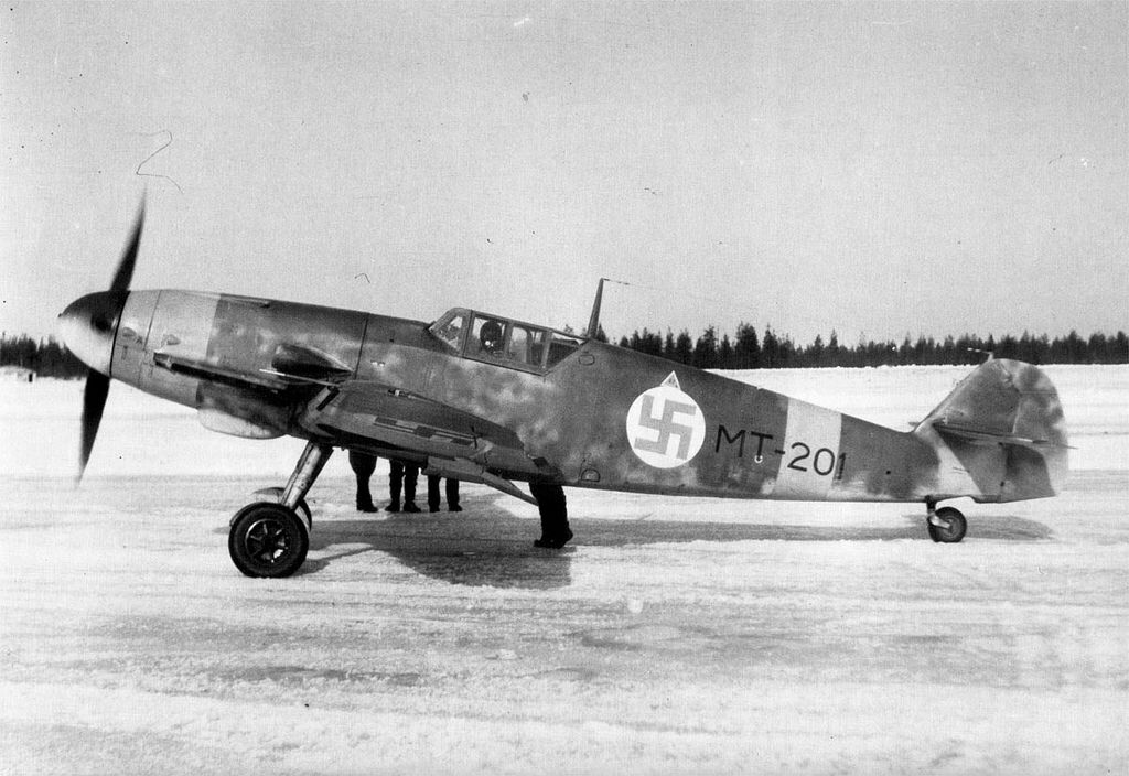 MT-201.заводской номер 14718 заводской код RF + UN. 09.03.1943 передан в 2/LeLv34 пилот майор О.Эрнрут. 01.05.1943 пилот майор Э.Луукканен. 18.08.1943 переведен в 3 / LeLv34 пилот майор Э.Луукканен. 04.05.1944 передан в 3/HLeLv24 пилот Капитан Х.Винд. 19.06.1944 переведен в 2/HLeLv24 пилот лейтенант О.Пуро. 01.07.1944 передан в 3/HLeLv28. 15.07.1944 Сержант Э.Рэсма сломал обе стойки шасси на взлете, попав в канаву. Самолет упал на брюхо. Сержант Э.Рэсма спасся без травм. 22.07.2944 был доставлен на авиазаводдля проведения ремонта и устранения повреждений. 20.12.1944 в полностью исправном состоянии сдан на хранение. Общий налет машины к этому моменту - 232 ч. 20 мин. 01.10.1952 утилизирован. По Финским данным самолет одержал в общей сложности 32,5 воздушные победы.