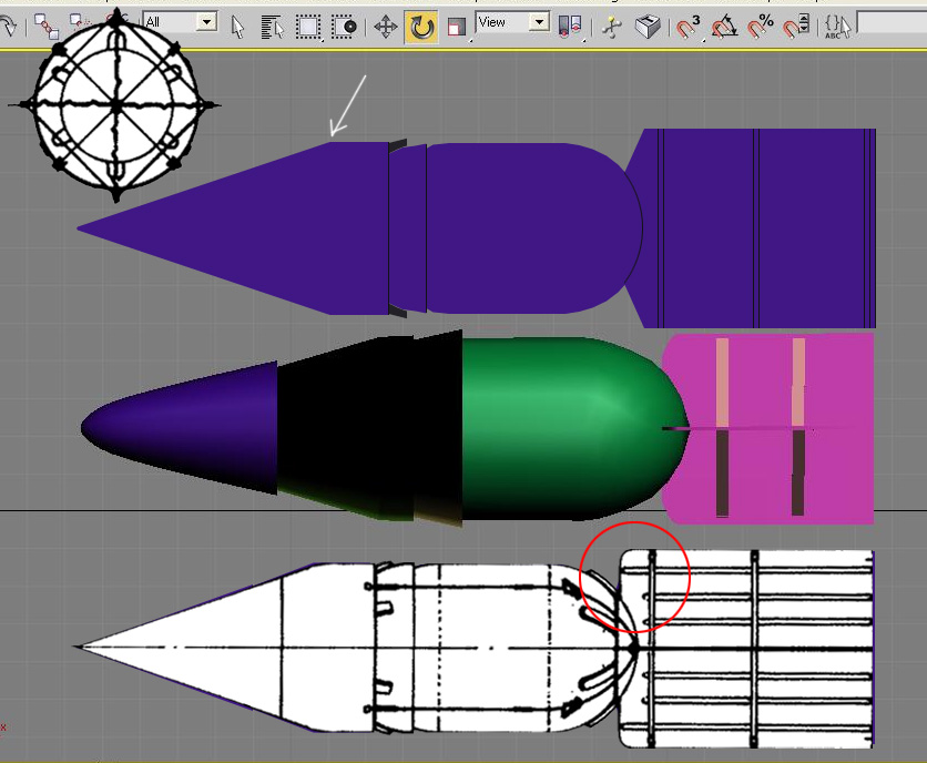 Вот, вообще прикладывал несколько чертежей. Они все немного разнятся, но схожи в размерах оперения по отношению к отпекаемому, отбрасываемому конусу. Кстати по фотке видно, что на нём нет никаких видимых уступов, и переход, который я обозначил белой стрелочкой, более плавный , чем на некоторых чертежах. Красным кружочком, более правильный, в соответствии с фото передний угол оперения. Кстати, нижнее перо на той фотке срезано, любопытно, как в игре, не срезанное, будет задевать об землю или нет .