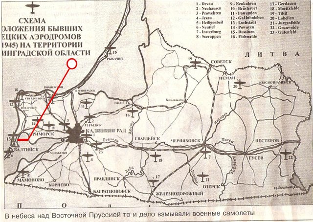 схема положения немецких аэродромов на территории Кал.области(это уже цитата).Извини скана нет ,но список вот: Devau,Neuhausen,Prowehren,Jesau, Heiligenbeil,Neutif,Insterburg,Seerappen, Neukuhren,Brusterort,Powunden,Gr.Hubnicken, Lohchstadt,Powauen,Rossitten,Eichwald, Gerdauen,Moritzfelde,Tlsit,Lo(e)belten, Jurgenfelde,Grunweide,Gutenfeld. Возможно был под Зеленым бором аэродром,но очень маленький