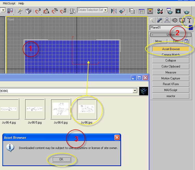 2-в закладке "Utilites" выбираете "Asset Browser" 3-в появившемся окне выбираете необходимый рисунок (на предупреждение в маленьком окне можно не обращать внимание - просто жмём ОК ) и простым перетаскиванием мыши отправляете его на вашу плоскость. Последний раз редактировалось AnWolf; 05.07.2011 в 22:54. |