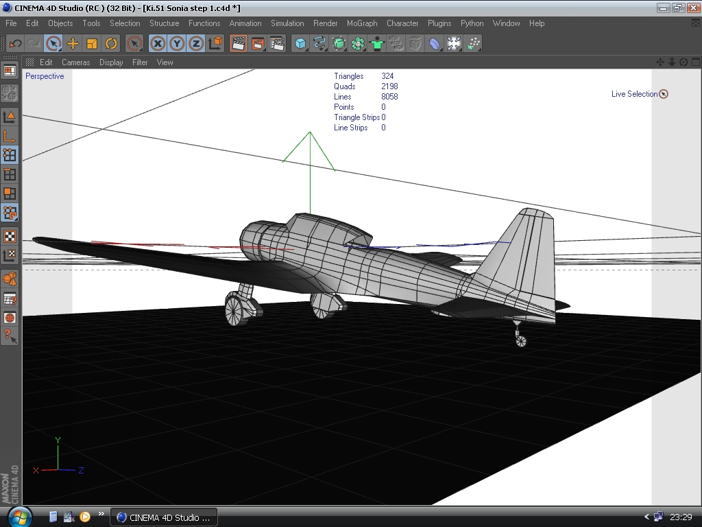Сейчас делаю лапти шасси и элементы крыла, скрины через несколько часов покажу. Все элементы конструкции существуют в рамках одного тела, т.к. на текущем этапе я хочу максимально использовать возможности одного меша, экструдируя, клонируя точки и соединяя их в полигоны.... позже по общей готовности я буду откреплять требуемые части в отдельные тела - отстыкую крыло от центроплана, рули и сдвижные части фонаря, створки радиатора станут самостоятельными объектами с перестановкой в нужные места и под нужным углом осей для вращения или перемещения... Работа с одним мешем позволяет сделать идеальную стыковку частей и иметь минимальное число полигонов без "засунутых вовнутрь" кусков конструкции, исключение тут - передняя часть фонаря. Конструкция все время подвергается мелким правкам, в т.ч. кромка руля высоты и пр. Мой глазомер устроен таким образом, что мне легче сверять пропорции по мере наращивания общей готовности, поэтому я периодически возвращаюсь к уже сделанным элементам и правлю их. Общий вес модели на текущий момент составляет 644 полигона и 674 точки, треугольников практически везде по 2 на полигон, т.е. классическое разбиение, т.к. я стараюсь перепрошивать полигоны вручную во избежание лишних тругольников. Труднее всего было сделать корневой наплыв крыла - там сильный перекос полигонов, что вообще-то нежелательно, но поскольку затенение в игре не "подсвечивает" такие перекосы да и вообще угловатость не видна, то особой проблемы это не представляет. Все, пошел работать далее...