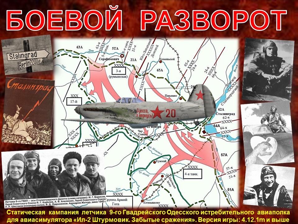 Предыстория отображаемых в кампании событий: предыдущие этапы боевого пути 69-го ИАП (будущего 9-го ГИАП) были отражены в ранее опубликованных кампаниях «Одесса, я вернусь!» http://forum.aviaskins.com/showthread.php?t=2604 и «Второе пришествие» http://forum.aviaskins.com/showthrea...636#post112636 Предлагаемая кампания является продолжением истории этого прославленного полка асов. Системные требования: процессор с тактовой частотой от 2,5 GGz, ОЗУ от 2GB. Для более слабых ПК кампания комплектуется минимизатором (см. «Порядок установки»). Версия игры: одна из двух, предлагаемых на выбор игрока: 1) От 4.12.1m без МОДов (доступна по умолчанию из меню «Карьера» после установки); 2) От 4.12.1m с картой Донбасса ( http://forum.aviaskins.com/showthread.php?t=2058 ) работы Oknevas. Подлежит активации по желанию игрока при наличии на его компьютере модифицированной версии игры от 4.12.1m и упомянутой карты. Никакие другие моды в кампании не использованы. Карты: Сталинград, сетевая №1, cетевая №2. В модифицированном варианте в дополнение к ним используются зимняя и летняя карты Донбасса. Порядок установки: по ссылке https://www.mediafire.com/file/95m9h...ssa-3.rar/file скачать архив «Odessa-3» размером 114 МВ и распаковать его в папку корневого каталога игры, соглашаясь на замену одноименных файлов. После этого в меню «Карьера» за ВВС РККА будет доступна кампания «БОЕВОЙ РАЗВОРОТ v.4.12.1». Если Ваш компьютер «не дотягивает» до указанных системных требований или Вы столкнулись с тормозами в процессе прохождения кампании, Вам пригодится выложенный отдельным архивом «Odessa-3-mini» патч-минимизатор, который можно установить поверх уже инсталлированной кампании - как перед ее началом, так и на любом этапе прохождения. Распаковав архив «Оdessa-3-mini» в папку корневого каталога игры с согласием на замену одноименных файлов и папок, Вы автоматически преобразуете свою полномасштабную версию в мини-версию. При этом название кампании в меню не изменится, статистика не пострадает, и Вы сможете спокойно продолжить прохождение кампании, только в более комфортных условиях. Активация модифицированного (с картой Донбасса) варианта кампании: требует наличия на ПК модифицированной версии 4.12.1m с уже установленной картой Донбасса. При соблюдении этих условий достаточно после установки кампании (по умолчанию устанавливается стандартная версия), распаковать содержимое архива «Odessa-3+Donbass» в папку корневого каталога игры, с согласием на замену одноименных файлов и папок. После этого в меню «Карьера» за ВВС РККА будет доступна кампания «БОЕВОЙ РАЗВОРОТ v.4.12.1+MODs». Разница между стандартной и модифицированной версиями кампании: как известно, с середины февраля по конец июля 1943 г. 9-й ГИАП базировался а районе Ростова с задачей прикрытия ж/д узлов Ростов и Батайск, а также проводя боевые вылеты в районе Миус-фронта. Этому периоду посвящены девять завершающих миссий кампании. В стандартном варианте они смоделированы на сетевой карте, а в модифицированном – на карте Донбасса. Какой вариант прохождения кампании предпочтителен лично Вам, решайте самостоятельно. Очередность операций «Донбасс-активации» и «минимизации» (если таковые потребуются) не имеет никакого значения. Продолжительность кампании: 28 миссий, 7 черно-белых роликов. Самолеты, пилотируемые игроком: Як-1Б. Рекомендуемое воинское звание: лейтенант. Рекомендуемый режим сложности: любой на усмотрение игрока. Опцию «Выполнение з