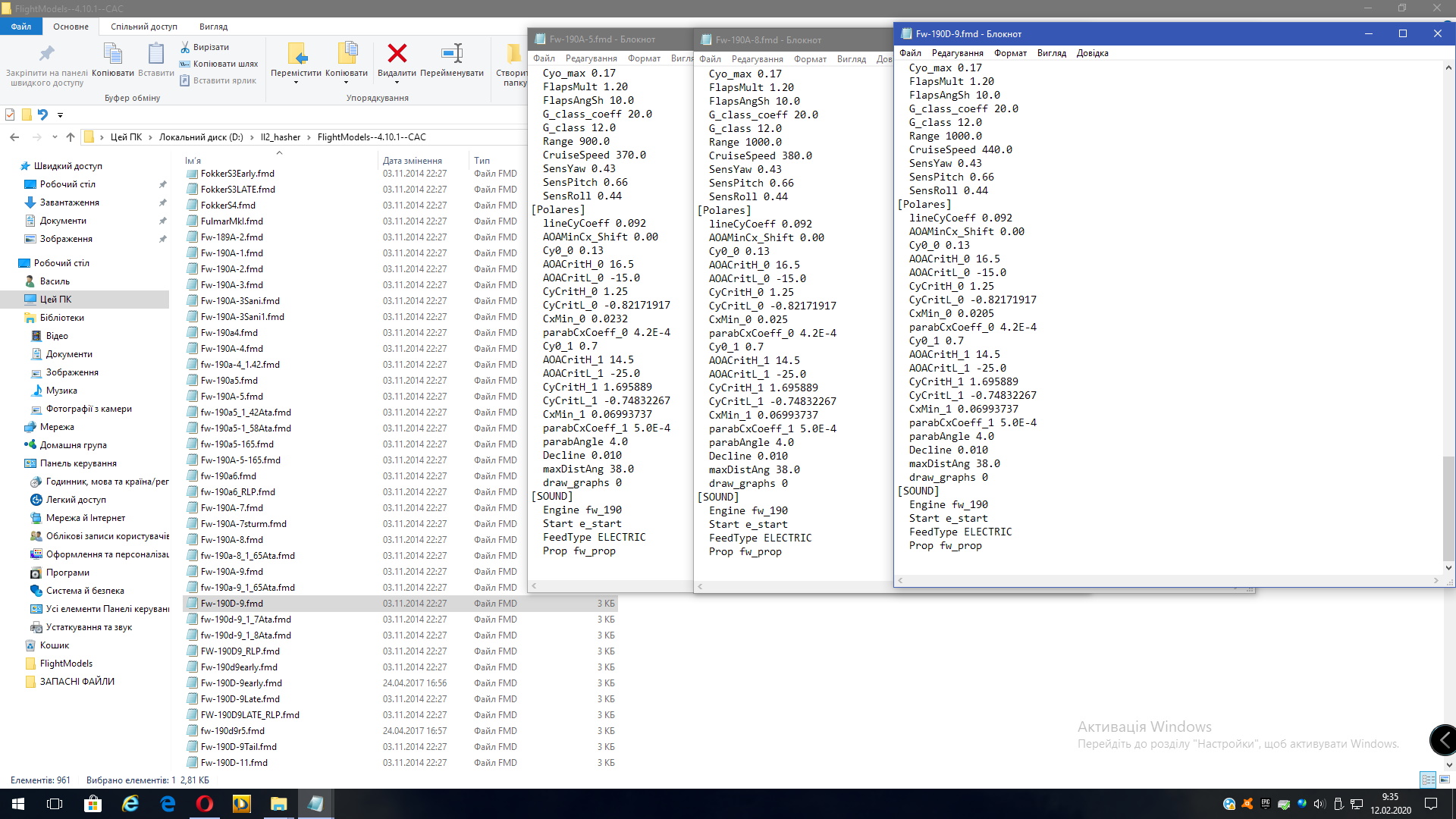 из патча 4.10.1 в патч 4.13.4+. Конечно же, все правильные размеры и плечи взяты и фм Фок из патча 4.12.2. Их там поправили. Саму поляру для Фок из фм поздних патчей считаю не верной. Почему? Потому что пропадают те отличительные черты, которые были у реальных самолётов и относительно отражались в виртуальном небе именно при данных цифрах в поляре фм в ранних патчах. -------------------------------------------------------------------- С новой же полярой в поздних патчах Фока стала отлично планировать с выключенным двигателем и пропал "доворот" на скольжении. Фока в реале отличалась не только отличной скоростью по крену, но и прекрасной маневренностью на косых петлях. Все эти моменты присутствуют/проявляються у Фок с полярой именно из патча 4.09-4.10. ---------------------------------- Очень долго настраивал Дору-9, особенно, позднюю с метанолом. Скорости у Доры приблизительно такие: у земли - ранняя Дора - 548/578 км. в час., позняя Дора - 548/608 км. в час., на высоте - ранняя Дора - 685 км. в час - 6000 метров., мощность 1900 л.с. поздняя Дора - 710 км. в час - 4870 метров. мощность - 2130 л.с. ------------------------- Моторы, естественно, новые, отрегулированные по тяге и высотности. Моторы для А - серии писал в прошлом году, они присутствуют в другом моём моде Фок. Дора-9 на номинале у земли набирает высоту в боевом развороте 1000 метров. Это отражено и в отчётах советских испытаний. Так же, подозреваю, что испытывали в НИИ Дору без всяких форсажных устройств, поэтому и показатели очень скромные. ![]() ------------------------------------------------- Приятных полётов!
