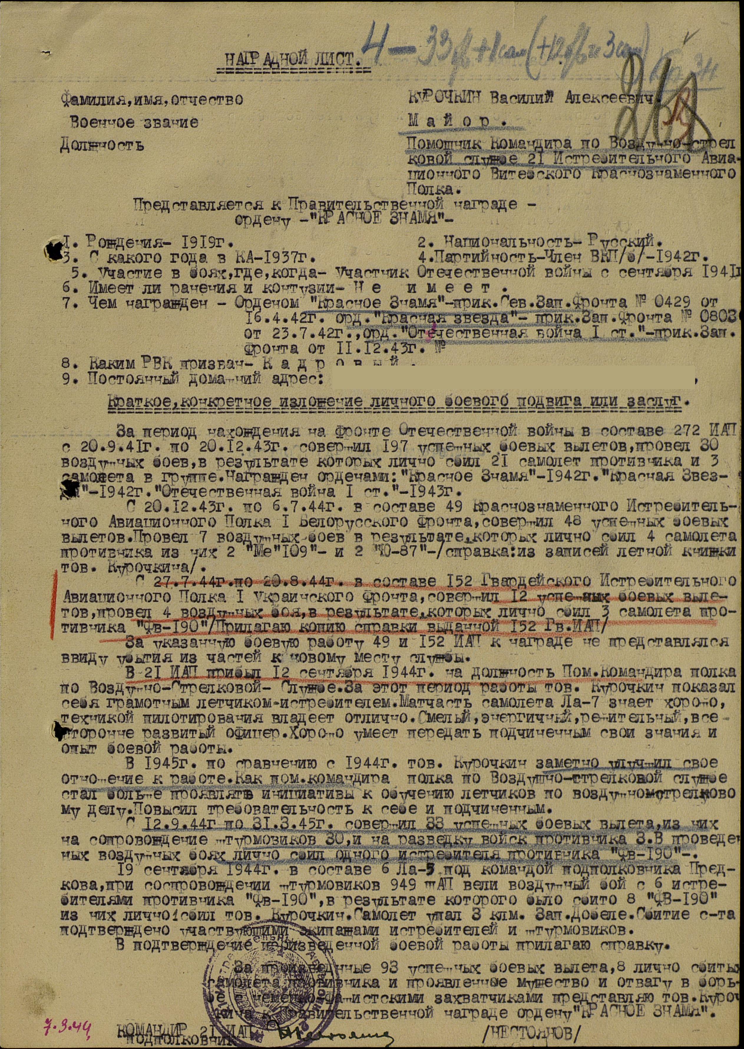 По Курочкину у меня у самого не очень много данных. Не знаю, в чем там было дело, но после того как сняли с фронта 272 иап, его постоянно бросали по разным полкам, причем часто получалось так, что даже не успевали представить к награде, а он хоп - и уже ушел в другой полк... Получается так, примерно: Курочкин Василий Алексеевич, 1919 г.р. Воевать начал в составе 272 иап на ЛаГГ-3 в звании старшего лейтенанта и должности командира звена. Летом 1943 года пересел на Ла-5. В декабре 1943 г. переведен в 49 иап. Потом (неожиданно) в июле 1944 года, уже майором, переведен в 152 гиап, где летал на Як-1б. Из 152 гиап в сенятябре 1944 года снова переведен на "лавочкины" в 21 иап, где закончил войну в звании майора. Всего выполнил более 300 боевых вылетов, лично сбил 30 самолетов и в группе 3. Список известных побед: 28.06.1942 1 Ме-109 Глагольня 09.07.1942 1 Ме-109 Новоселки 18.07.1942 1/4 Ме-110 Высокая 06.08.1942 1 Ю-87 Микульники 25.08.1942 1 Ме-109 Сметские Высоты 16.12.1942 1/2 Ме-109 Соколино 17.12.1942 1 Ю-87 Печора – Пруды 17.12.1942 1 Ю-87 совхоз Никольский 09.08.1943 1 Ме-109 сев.-вост. ст. Павлиново 09.08.1943 1 ФВ-190 Гнездилово 11.08.1943 1 Ю-87 зап. Острая Слобода 11.08.1943 1 ФВ-190 Выселицы 12.08.1943 1 Ю-87 зап. Дуброво 12.08.1943 1 ФВ-190 зап. Дуброво 15.08.1943 1 ФВ-190 р-н Гнездилово 18.08.1943 1 Ме-109 Горнячье 19.08.1943 1 ФВ-190 Ямное 19.09.1943 1 ФВ-190 Дворец – Чернево 12.10.1943 1/3 Хе-111 Баево – Застенок 13.10.1943 1 ФВ-190 Баево – Ленино 23.10.1943 1 ФВ-190 Гичи – Озеры 27.10.1943 1 ФВ-190 Остров – Юрьевский 08.01.1944 1 ФВ-190 юго-зап. Богушевск 04.03.1944 1 Ме-109 вост. оз. Сарро 07.03.1944 1 Ю-87 сев.-зап. Дубровна 11.08.1944 1 ФВ-190 Рачице 11.08.1944 1 ФВ-190 зап. Бжезины 17.08.1944 1 ФВ-190 Стопница 19.09.1944 1 ФВ-190 Лэмтини 07.04.1945 1 ФВ-190 Блюдау [+] 09-11.1941 1 Ме-109 Северо-Западный фронт 01-07.1944 1 Ю-87 1 Белорусский фронт Любопытно (уже в плане потенциального создания кампании) что в разных полках пилот выполнял преимущественно разные задания, 272 иап это в основном прикрытие войск и отражение бомберов, 49 иап это в основном расчистка, ЗПВ и свободная охота, 152 гиап - сопровождение штурмовиков, 21 иап - ближняя разведка и прикрытие разведчиков. Подробности смотрите на "Подвиге народа", там есть несколько наградных Курочкина. Или вот скажем ГСС Сиротин, у нас его знают в основном только по фотографии в кабине "Кобры" с орлом, а человек воевал с первого дня, причем начал на "чайках" в 123 иап на самой границе ЗОВО, в самой мясорубке сходу. Потом в 6 ИАК ПВО на Як-1, потом на ЛаГГ-3 на СЗФ и потом уже только "кобры" и 17 иап...