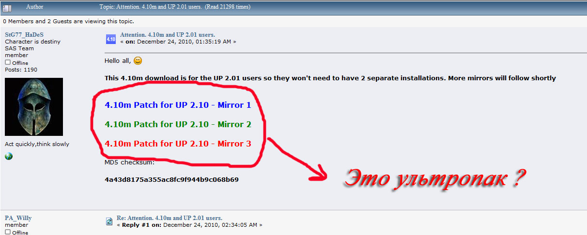 Тот - это http://www.sas1946.com/main/index.php?topic=23452.0 "Вот загрузки UP3RC4, в комплекте с последними селектора из DBW, а также в комплекте с Direct2Drive патч (он не будет причинять тебе боль, если вы не нуждаетесь в нем), и все. Чтобы иметь самые современные UP3 в этой моменты, все что вам нужно это, вам не придется скачивать ничего другого от где-либо еще. Это только версия клиента...Инструкция: скачать все 13 части superpatch в папку где-то, и запустить EXE (часть1). Следуйте своим инстинктам. " |