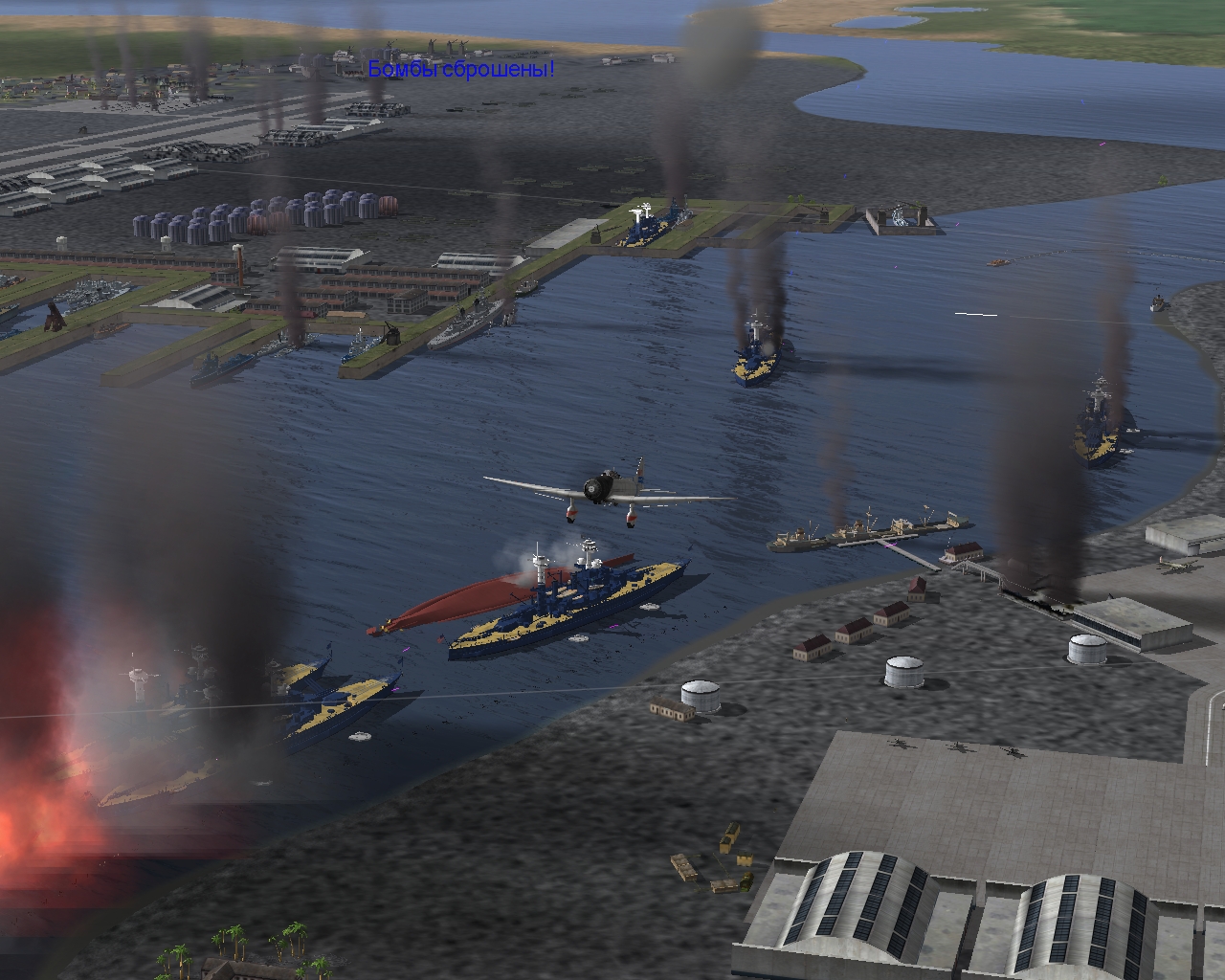 Миссия "Налёт на Перл-Харбор. Вторая волна" на D3A1. Обстановка в гавани воссоздана на основе фотографий. К сожалению, ввиду накладываемых игрой ограничений там нельзя размещать движущиеся корабли, поэтому линкор, изображающий "Неваду" остаётся неподвижным на фарватере.
