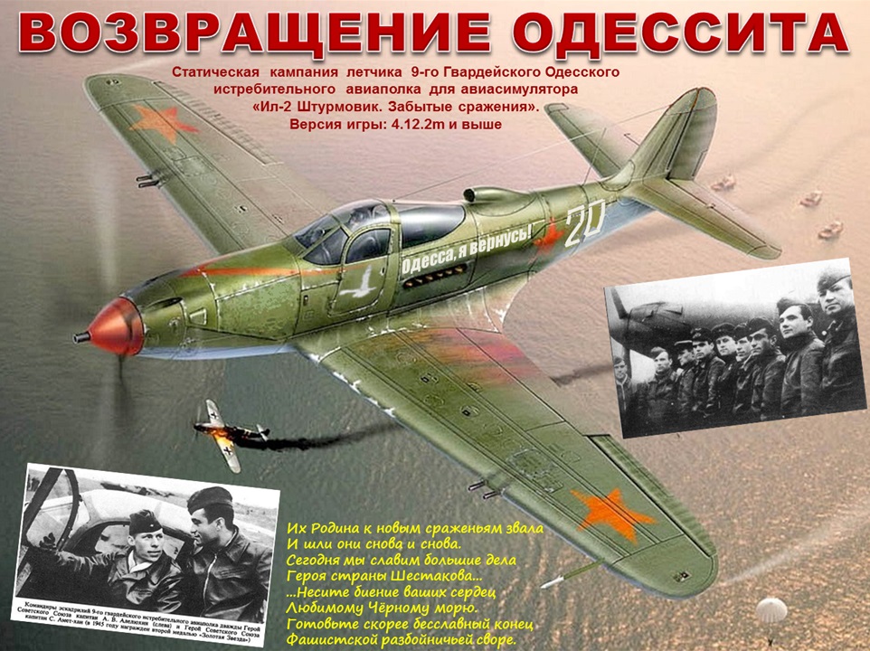 Предыстория отображаемых в кампании событий: предыдущие этапы боевого пути 69-го ИАП (будущего 9-го ГИАП) были отражены в трех ранее опубликованных кампаниях: «Одесса, я вернусь!» http://forum.aviaskins.com/showthread.php?t=2604 «Второе пришествие» http://forum.aviaskins.com/showthrea...636#post112636 «Боевой разворот» http://forum.aviaskins.com/showthread.php?t=3567 Предлагаемая кампания является продолжением истории этого прославленного полка асов. В ходе Великой Отечественной войны Советского Союза произошел коренной перелом. Страна сумела прийти в себя после двух лет тяжелых потерь и поражений. Враг был надломлен, и теперь уже советские войска огненной метлой выметали его со своей многострадальной земли. Крылатым гвардейцам 9-го истребительного авиаполка довелось принять в этом самое активное участие. Многие из них навеки остались во фронтовом небе. Но те, кто еще оставался в строю, все четче и четче понимали, что все-таки сдержат священную клятву шестаковцев, данную в далеком сентябре сорок первого. Эти три заветных слова: "Одесса, я вернусь!" стали для них боевым кличем и символом грядущей Победы. Именно этому этапу боевого пути 9-го ГИАП посвящена предлагаемая кампания. Системные требования: процессор с тактовой частотой от 2,5 GGz, ОЗУ от 2GB. Для более слабых ПК кампания комплектуется минимизатором (см. «Порядок установки»). Версия игры: одна из двух, предлагаемых на выбор игрока: 1) 4.12.2m без МОДов (доступна по умолчанию из меню «Карьера» после установки); 2) 4.12.2m с картой Донбасса от Oknevas http://forum.aviaskins.com/showthread.php?t=2058 , Подлежит активации по желанию игрока при наличии на его компьютере модифицированной версии игры 4.12.2m и упомянутой карты. Никакие другие моды в кампании не использованы. Карты: сетевая №1, cетевая №2, сетевая №3, Крым, Бессарабия. В модифицированном варианте в дополнение к ним используются карта Донбасса. Порядок установки: по ссылке http://www.fayloobmennik.net/4105187 скачать архив «Odessa-4» размером 98,98 МВ и распаковать его в папку корневого каталога игры, соглашаясь на замену одноименных файлов. После этого в меню «Карьера» за ВВС РККА будет доступна кампания «ВОЗВРАЩЕНИЕ ОДЕССИТА». Если Ваш компьютер «не дотягивает» до указанных системных требований или Вы столкнулись с тормозами в процессе прохождения кампании, Вам пригодится выложенный отдельным архивом «Odessa-4-mini» патч-минимизатор, который можно установить поверх уже инсталлированной кампании - как перед ее началом, так и на любом этапе прохождения. Распаковав архив «Оdessa-4-mini» в папку корневого каталога игры с согласием на замену одноименных файлов и папок, Вы автоматически преобразуете свою полномасштабную версию в мини-версию. При этом название кампании в меню не изменится, статистика не пострадает, и Вы сможете спокойно продолжить прохождение кампании, только в более комфортных условиях. Архив «Летный планшет Хасиса» распакуйте в любую удобную для Вас неигровую папку. В нем Вы найдете 9 графических файлов, содержание которых может при необходимости облегчить Вам «переучивание» на ленд-лизовский истребитель «Аэрокобра». Разница между обычной и мини-версиями: в мини-версии значительно сокращена интенсивность перестрелки на линии фронта, а также количество подвижных и стационарных объектов, особенно вдали от маршрута и аэродрома базирования игрока. Активация модифицированного (с картой Донбасса) варианта кампании: требует наличия на П