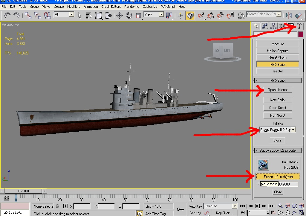 to The Radge, если плагин правильно установлен, то нажимать нужно эти кнопки(непосредственно для перегона в меш жмакнуть Export IL-2 .msh(text) и сразу жмакать на модель), после экспорта нажать Open Listener, там будет текстовый вариант меша, его копипастим в текстовый файл, который сохраняем и обзываем blabla.msh. Еще важное условие: перед экспортом модель нужно конвертировать в Эдитейб Меш