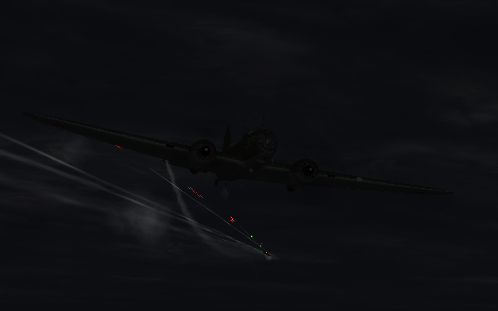 ![]() Сначала боялся что не найду цель в темноте, но таки нашел - точное выдерживание курса помогло ![]() Я уже направился домой, но тут на отходе стрелки прозевали мессера, который в двух атаках пробил мне баки, самолет стало сильно вести в сторону, и самое плохое, получил ранение, экран сильно покраснел. А ночью это, мягко говоря, неприятно. И так ведь видимость плохая. Я уже думал все, сейчас экран начнет темнеть, и придется или срочно прыгать, или на посадку идти где попало. Но дальнейшего помутнения вроде не наблюдалсь, и на сильно поврежденном ДБ я таки дотянул домой. Движки к счастью были не повреждены, но почему-то очень сильно вело в сторону, так и не понял почему. Повезло дотянуть до родного аэродрома и приземлиться, а это, я считаю, главное в каждой миссии!