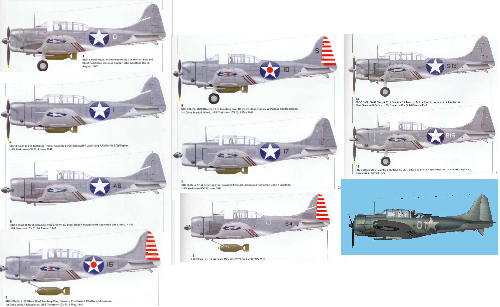Да с примером вообще никаких проблем нет. Вот на картинке подборка самого массового варианта бортовых номеров SBD-3, в 1942, когда он как раз массово применялся.