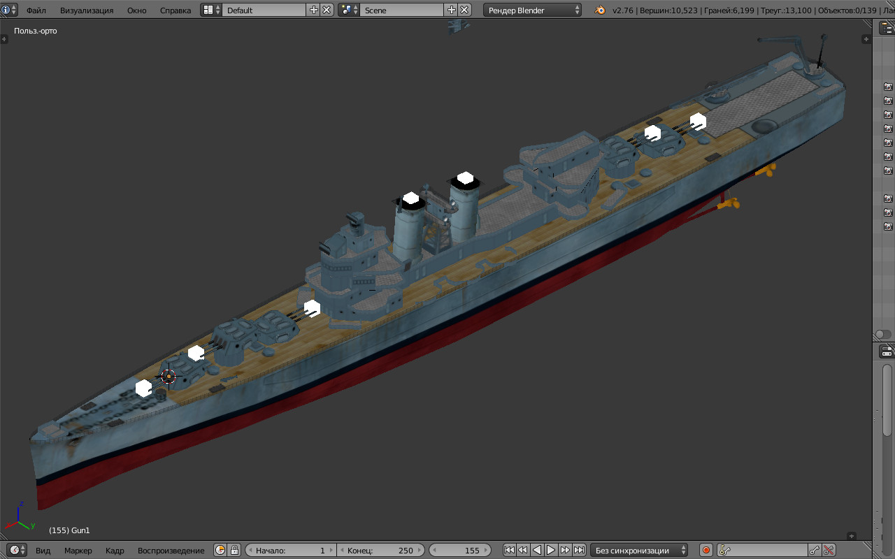Спасибо за модель. Открыл ее в блендере, модель очень точная, с обилием мелких деталей. Весит чуть больше двухсот пятнадцати тысяч треугольников и это только нулевой лод. Многовато... ЛК Конго в сборе (т.е лоды тени коллижены) весит больше трехсот сорока тысяч. При этом он довольно сильно притормаживает игру, а блендер на моём старом ноуте вообще отказывается с ним работать, дико тормозит. По чертежам модель не сверял, но наскоро сравнил с Шпее из SH3. SH-модель оказалась незначительно длиннее модели из WoWs. Корпус, надстройки без мелких деталей и вооружения весит семнадцать тысяч. Полагаю нулевой лод модели в сборе должен весить около двадцати-двадцати пяти тысяч треугольников. Но часть полигонов можно удалить. Вообще внимательно модель пока не рассматривал. Пока работаю с Бруклином. Всем мира.