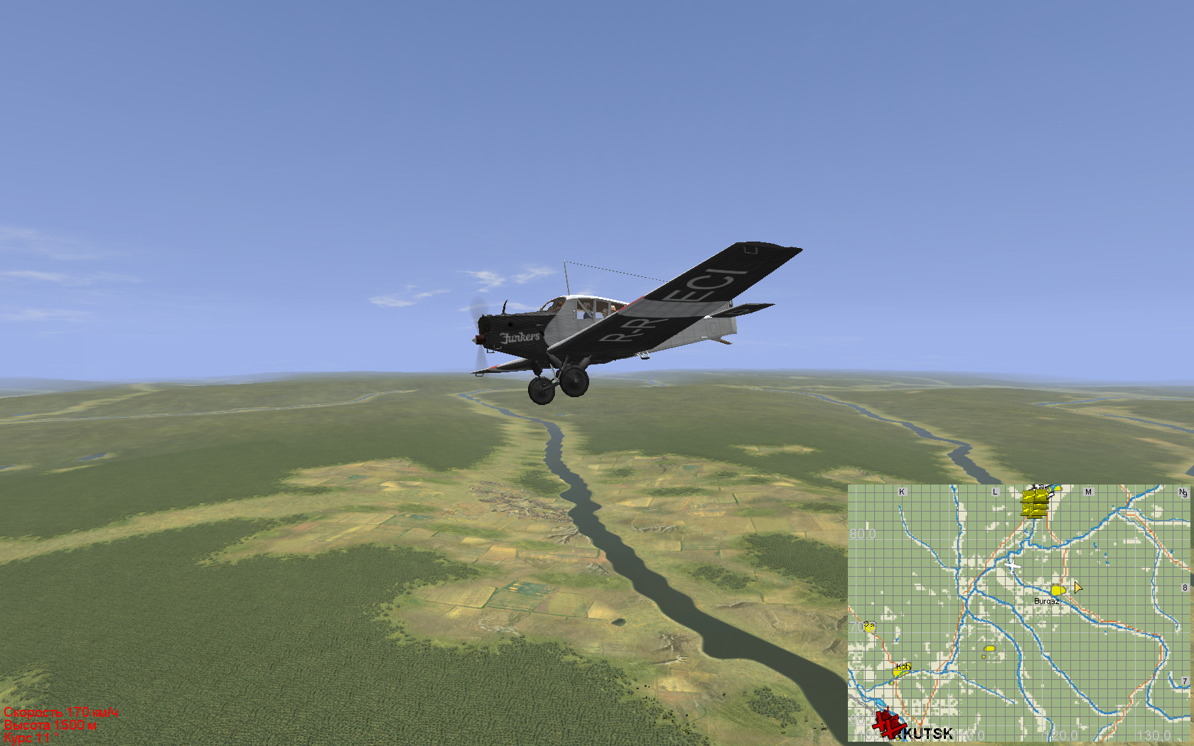 взлет с Иркутского аэродрома и полет в Усть-Ордынский(только это село, а у тебя там и городские дома есть)