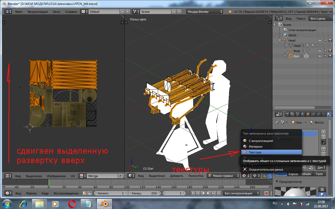 Продолжаем. В редакторе uv жмем изображение-открыть изображение. Открываем скин нашей зенитки(скрин1), Выделяем А развертку и сдвигаем её вверх на скин(скрин2) .В рабочем окне включаем вкладку текстура и режим объекта. Наслаждаемся результатом, затем повторяем процедуру для всех остальных частей зенитки. После чего командой ctr+j объединяем body с head, c образованием единого меша head. В итоге наших манипуляций появляется зенитка М4 в blend файле (скрин3). Конечно это только заготовка, нуждающаяся в доработке, однако уже в таком состоянии этот бленд-файл можно присоединить к любой подходящей модели судна. Хотя бы как статическую модель. И самое главное мы выполнили импорт стороннего 3D файла в блендер.