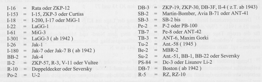 Bei der Bezeichnung der sowjetischen Flugzeugtypen herrschte auf deutscher Seite ein erhebliches, zum Teil noch bis weit in den Krieg hinein andauerndes Durcheinander, wobei nicht wenige Flugzeugmodelle gleich mehrere Bezeichnungen erhielten, wie die nachfolgende Übersicht veranschaulichen soll: