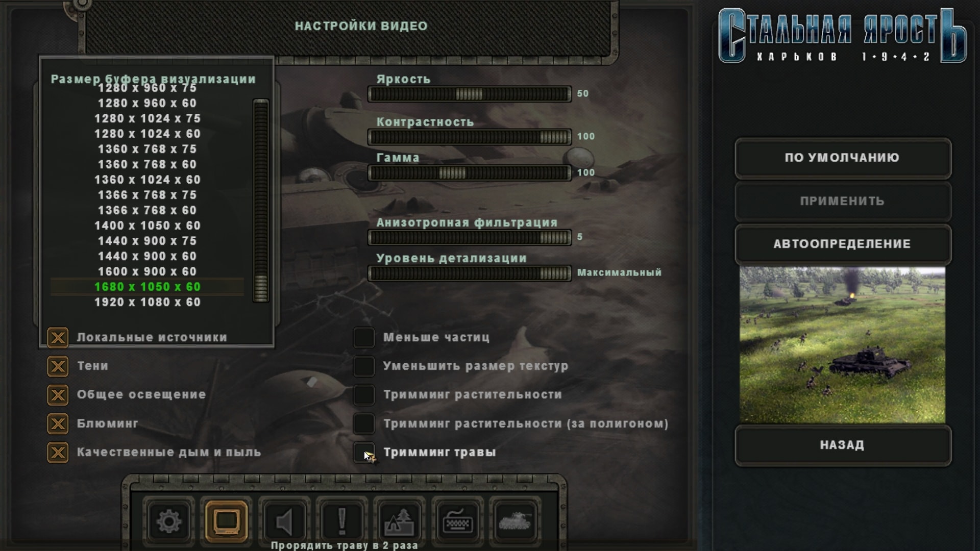 Поставил себе "Стальную ярость" вместе с модом 1.4, однако изображение весьма плохое, даже травы нет, а раньше, вроде , была! В настройках почему-то ничего не меняется! Кто сталкивался?