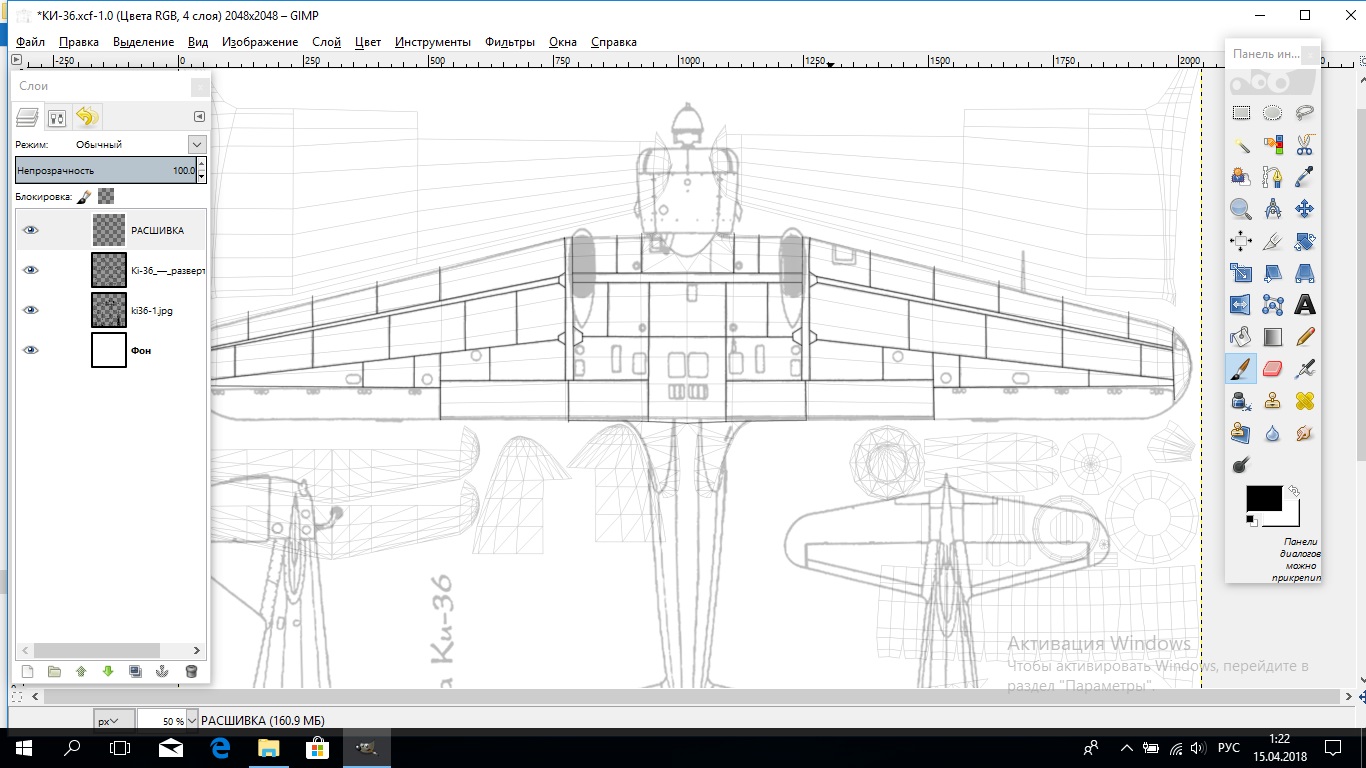 когда линия идет под углом к сторонам холста, образуя как бы ступеньку на каждый смещенный пиксель. Дойдя до фонаря кабины удалил всю проделанную работу, еще раз переделал развертку и сделав холст 2048 на 2048 начал работу заново. Вот первые результаты, рисую в Гимпе ,трехпиксельной кистью. Пожалуй линии излишне толстые, зато нет эффекта "ступеней". Кроме этого думаю уменьшить и сгладить линии с помощью Гауссова размывания, а если, как я предполагаю, уменьшить разрешение текстуры до 1024, линии вообще станут тоненькими. Как то так.