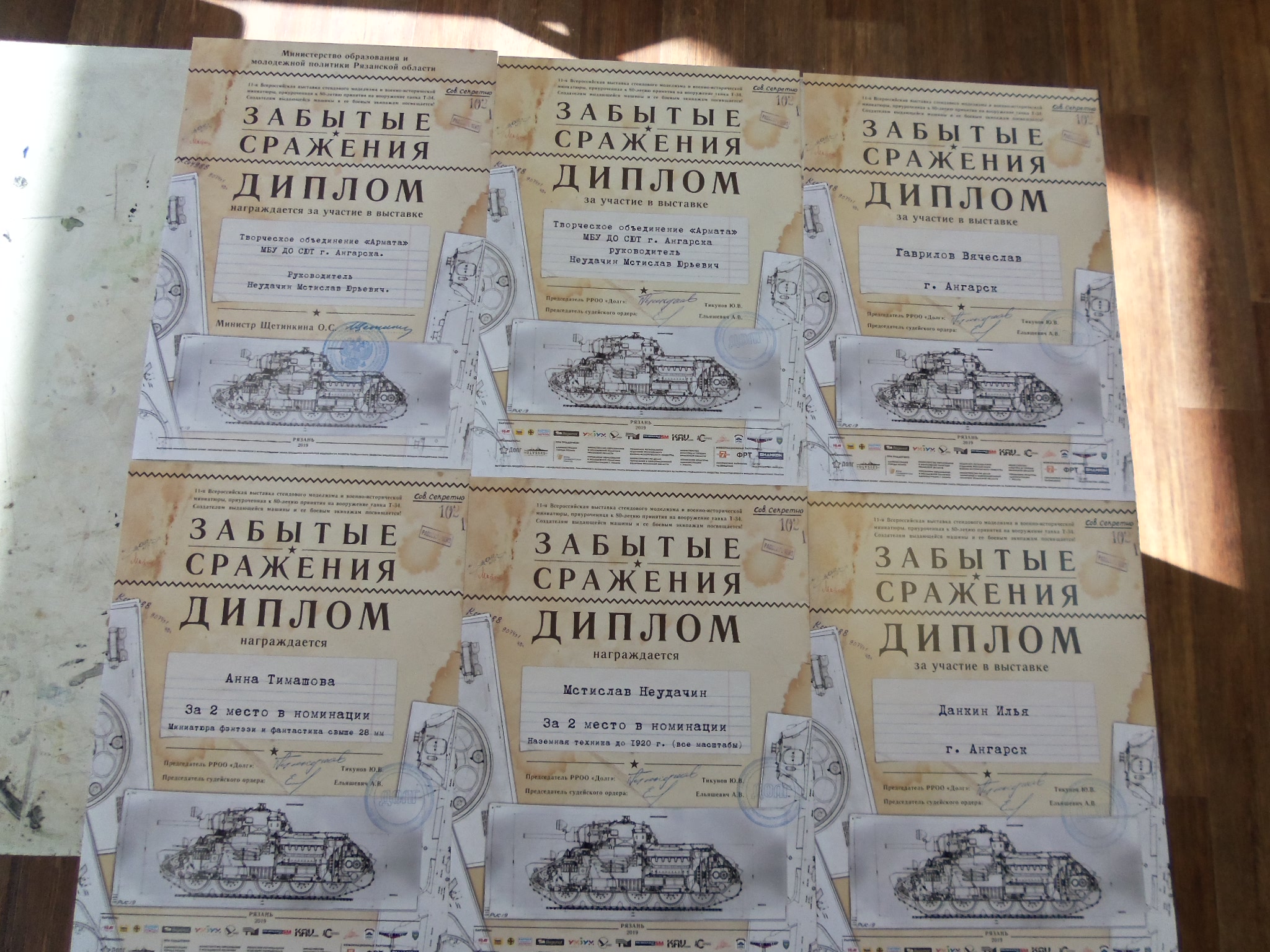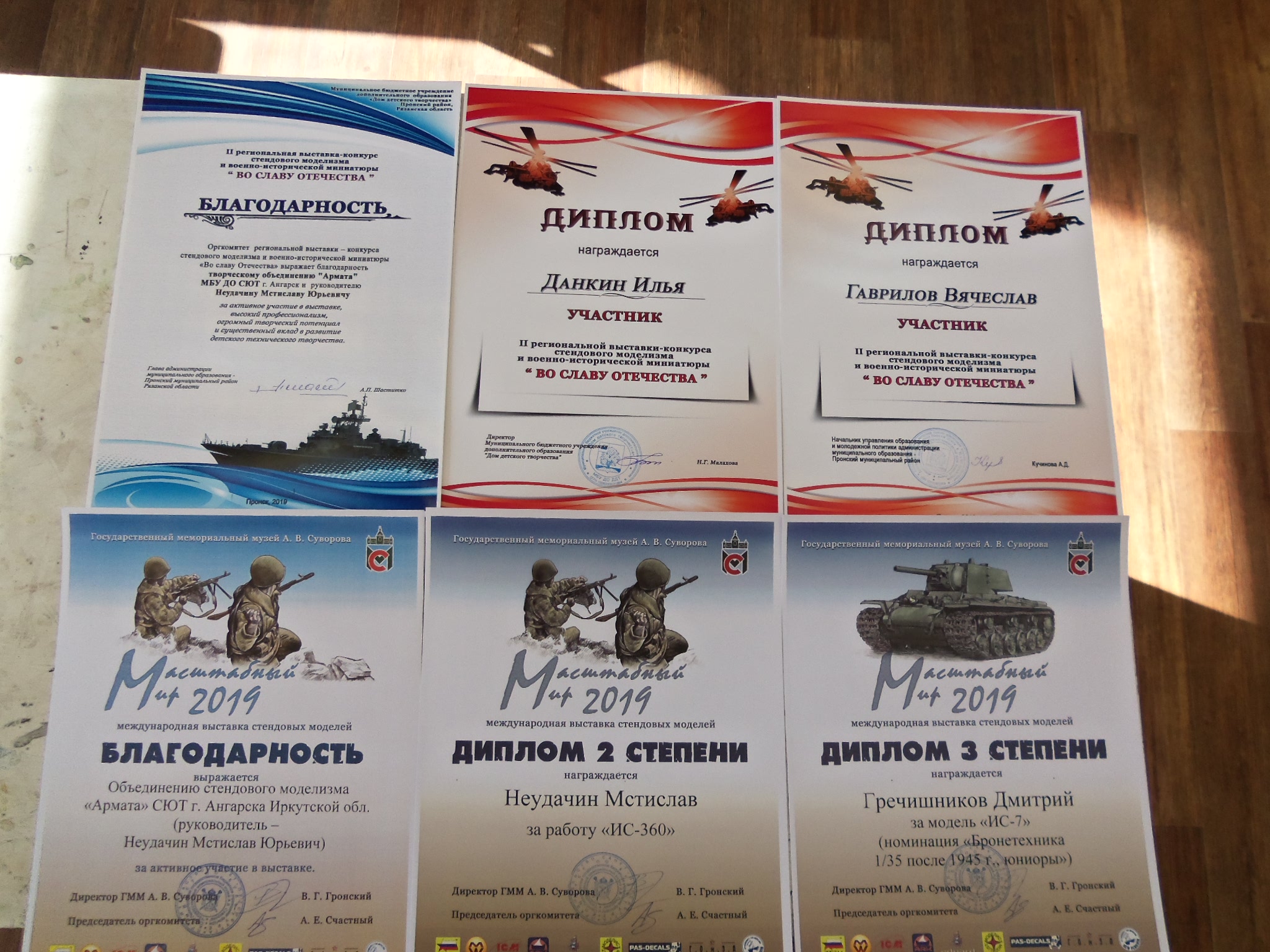 ВСЕРОССИЙСКОЙ ВЫСТАВКИ-КОНКУРСА СТЕНДОВЫХ МОДЕЛЕЙ И МИНИАТЮРЫ "ГЕРОИ ЖИВЫ, ПОКА МЫ О НИХ ПОМНИМ" г. Москва. 1 место Неудачин М.Ю. 2 место Елисафенко Павел 3 место Елисафенко Павел Благодарственное письмо Неудачину М.Ю. 6-я открытая всероссийская выставка-конкурс «Мини-Макс-2018, г. Москва. большой сбор» 1 место Баглай Никита 2 место Неудачин М.Ю. 2 место объединения стендового моделизма СЮТ. Сибирский слет моделистов, в рамках 6 алтайского конкурса стендового моделизма. г. Барнаул. 1 место Неудачин М.Ю. 2 место Неудачин М.Ю. 3 место Елисафенко Павел 12-я ежегодная международная выставка стендовых моделей и военно-исторической миниатюры «Техника в масштабе» г. Тула 1 место Данкин Илья 2 место Неудачин М.Ю. 3-я международная выставка-конкурс Freedom Cup - "Кубок Свободы" г. Тайбей, Тайвань. Неудачин М.Ю. – вошел в 10-ку лучших. Муниципальная выставка «Творческий каледоскоп» посвешеная 100-ю дополнителного оброзования среди уч-ся учереждений орозования АГО. 1 место Бородин Сергей 1 место Литвинов Ярослав 2 место Силкин Сергей 2 место Петрашкевич Лиза 2 место Гречишников Дмитрий 3 место Баглай Никита 3 место Ткаченко Вячеслав VIII Межрегиональной выставки-конкурса стендового моделизма и военно-исторической и игровой миниатюры -Ижевск 2018 1 место Гречишников Дмитрий 2 место Неудачин Мстислав Dish Models-2018. Виртуальный конкурс Приз зрительских симпатий (1 место) Неудачин М.Ю. Г. Шелехово районная выставка «Вторая жизнь вещам» 2 место Гречишников Дмитрий НовоСлет-2019 г. Новосибирск Спецпризы от генерального партнера НовоСлет-2019 фирмы «Звезда». Диплом от фирмы «Звезда» - Лябов Эдуард Диплом I степени Литвинов Ярослав Диплом II степени Косяк Александр Диплом I степени Бородин Сергей Диплом III степени Данкин Илья Диплом I степени Гаврилов Вячеслав Диплом II степени Данкин Илья Диплом I степени Неудачин Мстислав Диплом I степени Неудачин Мстислав Диплом I степени Неудачин Мстислав ДИПЛОМ - КАВЗ. Неудачин Мстислав Диплом II степени Гречишников Дмитрий Виртуальный конкурс ГБ_ПОСТАП_18 1 место Неудачин М.Ю. МЕЖДУНАРОДНАЯ ВЫСТАВКА-КОНКУРС СТЕНДОВОГО МОДЕЛИЗМА И ВОЕННО-ИСТОРИЧЕСКОЙ МИНИАТЮРЫ «МАСШТАБНЫЙ МИР-2019» Диплом 2 степени - Шаротанк ИС-360м. Неудачин Мстислав (Ангарск) Диплом 3 степени – ИС-7 Гречишников Дмитрий (Ангарск) 11 Всеросийская выставка стендового моделизма и военно-исторической миниатюры приуроченная к 80-и летию принятия на вооружения танка Т-34. «Забытые сражения». 2 место Неудачин Мстислав(Ангарск) СЮТ Ангарск Выставка технического творчества "Техническое творчество юных" среди учащихся 1-11 классов. 1 место Тихоненко Игорь 1 место Литвинов Ярослав 1 место Бородин Сергей 2 место Гречишников Дмитрий 3 место Петрашкевич Елизавета Нижний Новгород 11-я Нижегородская Всероссийская выставка-конкурс стендового моделизма «Защитники Отечества», посвящённой 74-й годовщине Победы в Великой Отечественной войне. Наши результаты. 1 место Гречишников Дмитрий 1 место Гречишников Дмитрий 1 место Данкин Илья 1 место Бородин Сергей 1 место Бородин Сергей 2 место Неудачин М.Ю.