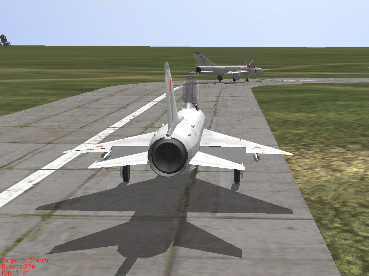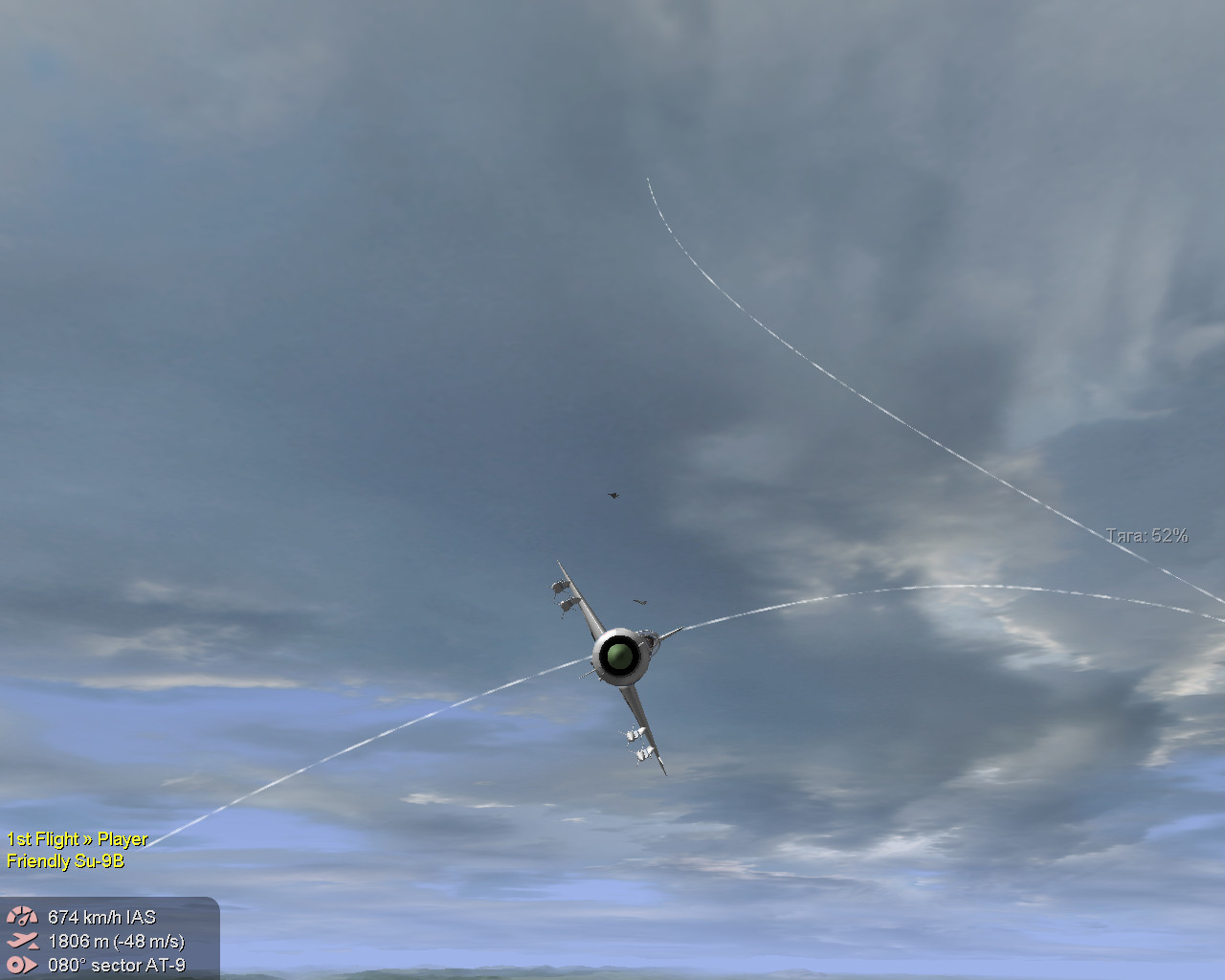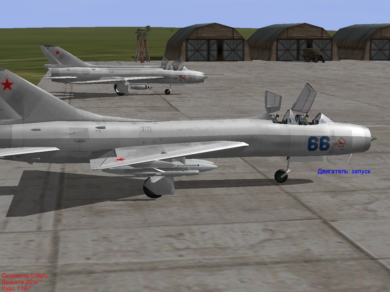 Текст брифинга: «В 1972 году в истребительной авиации ПВО был принят новый Курс боевой подготовки для частей, вооруженных истребителями-перехватчиками СУ-9 (КБП СУ-9 72) в котором содержалась новая методика перехвата воздушных целей с типовыми профилями полета, что обеспечивало наибольший возможный рубеж перехвата. С учетом опыта боевых действий во Вьетнаме и на Ближнем Востоке в новом КБП уделялось повышенное внимание маневренному воздушному бою. Однако, широкого практического применения такой способ боевого применения самолета СУ-9 в строевых частях ПВО не получил. Это было связано с тем, что комплекс вооружения и бортовая РЛС самолета СУ-9 не были приспособлены для маневренных воздушных боев. Пуск УР класса «В-В» РС-2УС и Р-55 должен был производится только в заднюю полусферу (ЗПС) воздушной цели, после сближения с целью и входа перехватчика в зону разрешенных пусков ракет. А для поражения цели ракетами РС-2УС необходима еще была и непрерывная «подсветка» цели лучем бортовой РЛС. Выполнить все эти условия в процессе маневренного воздушного боя было крайне сложно, а артиллерийского вооружения самолеты СУ-9 не имели. Поэтому, в основном, истребители-перехватчики СУ-9 могли применяться для перехвата высотных, мало-скоростных и скоростных, но ограниченно-маневренных воздушных целей, типа самолетов-разведчиков (U-2), бомбардировщиков (В-47, В-52, В-58) и автоматических разведывательных дрейфующих аэростатов (АДА). Однако, в некоторых строевых частях ПВО (например, в 136-ом ИАП ПВО, базировавшегося на аэродроме Кировское в Крыму и входившего в 8-ю ОА ПВО) на самолетах СУ-9 отрабатывались и групповые воздушные бои. 18 августа 1972 года – праздник День Авиации СССР. Совместным распоряжением ГК Войск ПВО страны и ГК ВВС принято решение о проведении на аэродроме Кировское (Крым) показательного группового маневренного воздушного боя пары истребителей-перехватчиков СУ-9 с парой фронтовых истребителей МИГ-21ПФМ. Обе пары должны быть без оружия и иметь не полный запас топлива, подвесные топливные баки не подвешиваются. На аэродром Кировское были приглашены многочисленные гости – они приехали на автобусах и расположились около штаба 136-го ИАП ПВО. Вы командир эскадрильи 136-го ИАП ПВО. Вам и вашему заместителю поставлена задача провести маневренный воздушный бой с парой МИГ-21ПФМ из соседнего истребительного полка ВВС. Полетное задание: Парой вырулить со стоянки, выполнить взлет и набор высоты 1300 м. Развернуться в сторону аэродрома, набрать высоту 2000 м и встать в круг над аэродромом. При визуальном обнаружении пары МИГ-21, подходящей к аэродрому, энергичным маневрированием зайти в ЗПС этой паре, сблизиться с ней на дистанцию разрешенного пуска ракет и удержаться на «хвосте» пары не менее 1 минуты – только в этом случае Вам будет присуждена победа в воздушном бою. Постарайтесь далеко не уходить от аэродрома – за вами внимательно наблюдают с земли! После выполнения задания произвести посадку на аэродроме Кировское и зарулить на свою стоянку». Коллеги, кроме этой безоружной миссии я сделал еще два ее варианта с подвесным вооружением: 1. обе пары вооружены УР РС-2-УС (на СУ-9 их по 4 шт, на МИГ-21ПФМ их по 2 шт). 2. пара СУ-9 вооружена УР Р-55 (их 4 шт на каждом самолете), пара МИГ-21ПФМ вооружена УР Р-3А (их 2 шт на каждом самолете). При этом, на обоих парах нет подвесных топливн