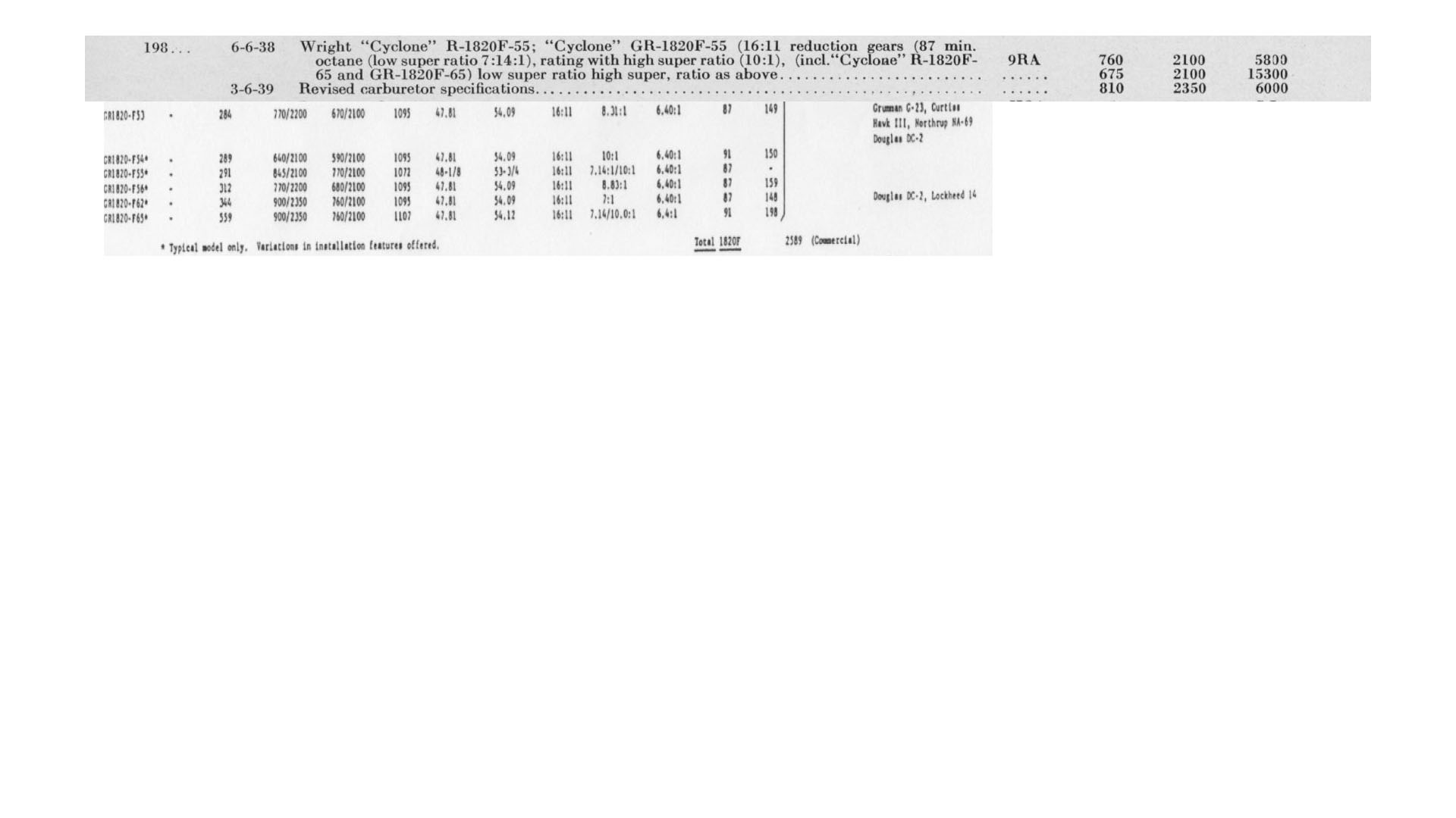 [Wright-Cyclone-GR-1820F-62-65] Type Radial Autonomous 1 Cylinders 9 Carburetor 1 Direction Right TowFactor 1.0 EngineAcceleration 3.5 Extinguishers 3 HorsePowers 803.0 // 760.0x1.0566(коефициент винта)=803.0 BoostFactor 1.00 WEPBoostFactor 1.18421053 cAfterburner 0 AfterburnerType 10 Thrust 0 PropMass 165.0 RPMMin 400 RPMNom 2100.0 RPMMax 2100.0 RPMMaxAllowed 2550.0 Reductor 0.6875 PropDiameter 3.34 PropAnglerType 2 PropAnglerSpeed 0.10 PropAnglerMinParam 1443.75 PropAnglerMaxParam 2100.0 PropAnglerAfterburnerParam 2350.0 PropPhiMin 19.0 PropPhiMax 50.0 PropAoA0 11.0 Voptimal 300.0 cCompressor 1 CompressorType 1 CompressorSteps 2 CompressorRPMCurvature 4.5 CompressorPAt0 0.5 CompressorPMax 1.41579 CompressorAltitude0 1770.0 CompressorMultiplier0 1.0 CompressorBaseMultiplier0 1.0 CompressorAltitude1 4663.0 CompressorMultiplier1 0.8881579 CompressorBaseMultiplier1 0.8881579 CompressorRPMP0 900.0 CompressorRPMPMax 2350.0 CompressorMaxATARPM 1.18 CompressorSpeedManifold 0.7 CompressorRPM0 450 CompressorATA0 0.45 CompressorRPM1 1200 CompressorATA1 0.74 CompressorRPM2 1600 CompressorATA2 0.94 CompressorRPM3 1850 CompressorATA3 1.08 CompressorRPM4 2000 CompressorATA4 1.12 CompressorRPM5 2100 CompressorATA5 1.18 CompressorRPM6 2350 CompressorATA6 1.41579 DisP0x 2300 DisP0y 0 DisP1x 0 DisP1y 50 TESPEED 0.02 TWATERMAXRPM 200 TOILINMAXRPM 70 TOILOUTMAXRPM 85 MAXRPMTIME 600 MINRPMTIME 999 TWATERMAX 240 TWATERMIN 120 TOILMAX 105 TOILMIN 40 |