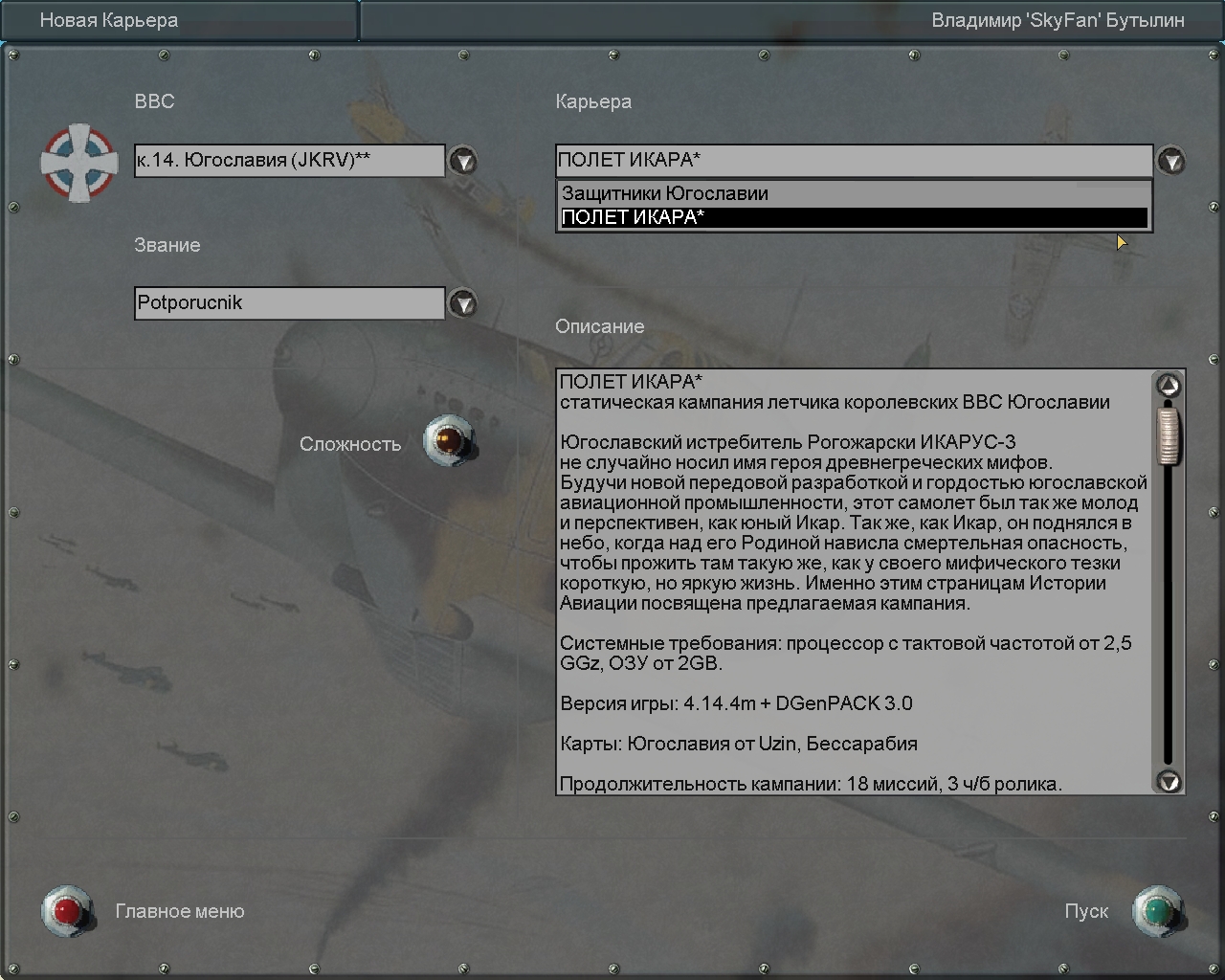 Спасибо за внимание к кампании. Для того, чтобы в доступном игроку списке частей и подразделений появились 161-я и 162-я эскадрильи Королевских ВВС Югославии, в составе которых в реале летали герои кампании Папка cache копируется не в папку #DGEN, а в папку PaintSchemes корневого каталога игры. То, что она лежит не по адресу - мой косяк. ![]() Путь исправления: после распаковки архива в корень "Ила" вручную переместить папку Cache из корневой папки в папку PaintSchemes с согласием на замену. Приношу извинения за неудобства. ![]() Цитата: