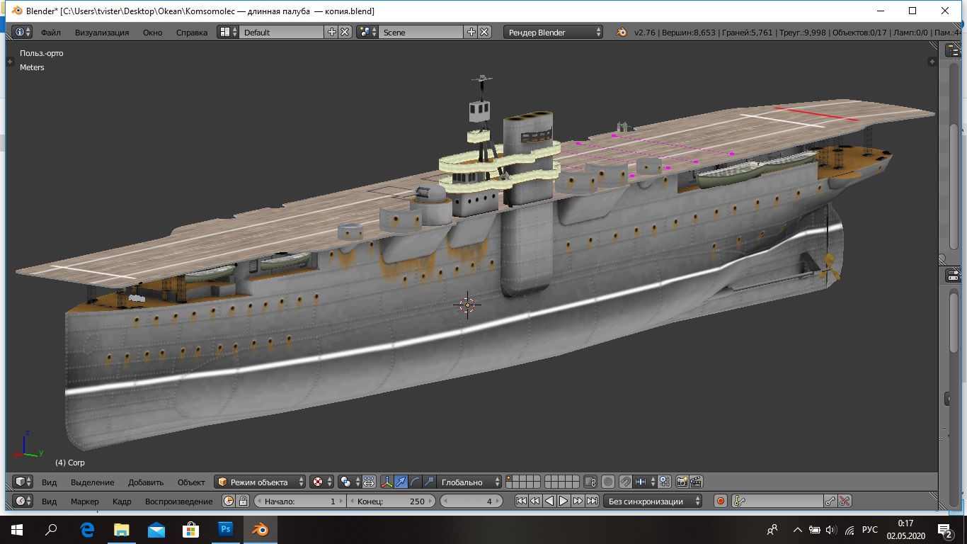 Маленько погорячился по поводу "двух-трех дней", привалило основной работы. Но даже так, дорисовал всякую мелочь на скинах надстроек и корпуса, добавил шлюпок. Осталось три больших момента, дорисовать полетную палубу (хотя бы навести контуры как я её вижу), добавить поручни и лестницы. Грязи, копоти и ржавчины набросать. Ну и якорное устройство собрать.