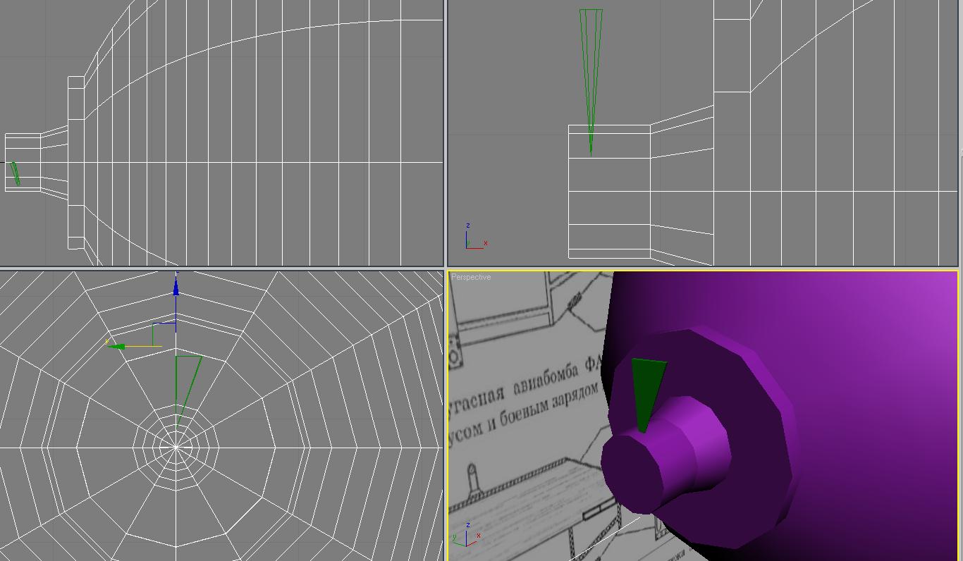В этом уроке мы сделаем новенькую бомбу для Ил-2. Я не буду рассказавыть вам, как распаковывать sfs файлы и устанавливать моды, так как рассчитываю на то, что вы это знаете. Итак! Для того чтобы сделать собственную бомбу нам необходимо: 1.3d Max 09 2.MshConverter 1-18 http://allaircraftarcade.com/forum/viewtopic.php?t=7473 3.Adobe photoshop (любой, но я предпочитаю CS3) 4.Il-2 Exporter V2.52A http://allaircraftarcade.com/forum/v...ic.php?t=10492 И для начала установим плагин V2.52. Для этого скачайте плагин, откройте коневую папку 3ds max 9, найдите там папку Scripts и скопируйте всё содержимое архива в нее, включая иконку. Всё. Плагин установлен. Теперь мы решим какую бомбу мы будем делать. В этом уроке я сделаю ФАБ-100. Для этого мы лезем в интернет и находим чертежи бомбы, желательно разрешения побольше. Я нашел такой: Так. Теперь загружаем 3д макс и в окне просмотра Front создаем объект plane с размерами такими-же, как наш чертеж. В моем случае это 1570х1165 Теперь открываем редактор материалов (клавиша М) и назначем любому материалу в мтроке Diffuse карту Bitmap. В появившемся окне выбираем наш чертеж. Теперь выделите plane и нажмите в редакторе материалов Assign Material to selection, а затем нажмите Show Map in View, чтобы видеть текстуру в окне просмотра. Чтобы видеть текстуру в окне Front, перейдите в это окно и нажмите клавишу F3. Быть может, что у вас текстура будет очень размытая. Чтобы это исправить, Идите в меню Customize и выберите в нем Preferences... В появившемся окне перейдите во вкладку Viewports и в разделе Display drivers нажмите кнопку Configure Driver. В открывшемся окне Поставьте Background Texture Size на 1024 и Download Texture Size на 512 В обоих пунктах поставьте галочку на Match Bitmap size as Clozely as Possible. После этого нажмите ОК, сохраните работу и перезапустите 3д макс. Получилось? Хорошо! Теперь идите в окно Front и нажмите Maximize Vieport Toggle, чтобы видеть только это окно просмотра. Теперь масимально приближаем чертеж бомбы, выбираем во вкладке Shapes инструмент Line и обводим симметричную ПОЛОВИНУ контура бомбы вот так: Далее настраиваем сплайн так, чтобы он максимально точно повторял контур бомбы и применяем к нему модификатор Lathe. Если моделька у вас построилась неправильно, то настройте в модификаторе параметр Axis и, если надо, поставьте галочку на Flip normals. теперь перейдем к сегментам. Бомба не должна страдать полигональным голоданием, но и не должна быть избыточно детализированой. Постарайтесь найти золотую середину и помните, что в Ил-2 моделька будет выглядеть немного более гладкой, чем в максе. Я поставил Segments на уровень 10. Теперь выделите модель бомбы правой кнопкой мыши и нажмите Convert to --> Editable mesh. Выделите те точки, вокруг которых "вертелась" наша моделька (эти точи долныбыть по центру модели с начала и с конца). и нажмите Weld -> Selected, чтобы соединить их воедино. Если они не соединились, то немного увеличте параметр Selected, но не переборщите, а то задняя и передняя точки соединятся. Теперь перейдем к созданию стабилизаторов и этих крутящихся штук (извините, не знаю, как они называются не спец по бомбам) спереди и сзади бомбы. Я буду звать их пропеллерами)))). Создадим объект Box, который будет лопастью пропеллера. Соответственно он должен иметь длину, ширину и толщину лопасти. Сделаем из него editable Mesh и придадим ему форму треугольника применив Weld к его нижним точкам. Разместим его так, как показано на рисунке (или так, как хотите вы). Теперь настроим точку его вращения. перейдите во вкладку Hierarchy, выберите там Affect Pivot Only и поместите ось враще