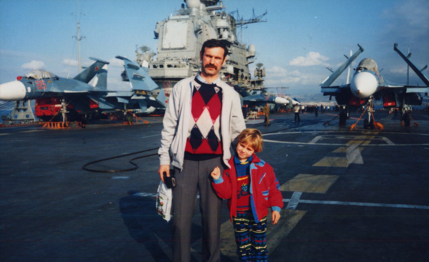 А потом была двух летняя командировка в Сирию – 1994-1996 г.г. (г. Алеппо, Сирийская Военно-инженерная академия, авиационный факультет – я там вел дисциплину «Тех. диагностика боевой АТ»). Там я был с женой и младшей дочерью, школьницей последних классов (старшая дочь осталась в Краснодаре, т.к. поступила в институт). Так вот – в 1996 г. в Сирию, с дружеским визитом, в сирийский приморский порт Тартус пришел наш авианосец «Адмирал Кузнецов» с сопровождающими его кораблями. Авианосец с сопровождением возвращался из своего первого Средиземноморского похода (с 23 декабря 1995 г по 22 марта 1996 г). Поход был знаменательным и о нем ниже. Так вот – нас, русских преподавателей сирийской военной академии (с женами и детьми) пригласили посетить группу кораблей, входящих в состав сопровождения авианосца «Адмирал Кузнецов». Эсминец «Бесстрашный» (возглавлявший сопровождение авианосца) стоят у причала порта – на нем и была запланирована встреча гостей, т.е. нас. А сам авианосец «Адмирал Кузнецов» с палубными самолетами на борту стоял на рейде порта, примерно в полутора км от него и экскурсия на него не планировалась. Все верхнее руководство авианосной группы во главе с первым заместителем Главкома ВМФ РФ адмиралом И.В.Касатоновым убыла в Дамаск (столицу Сирии) на дружескую встречу с Президентом и Министром обороны Сирии (в составе этой делегации был и командир 57-ой Отдельной корабельной авиационной дивизии генерал-майор авиации Тимур Апакидзе).