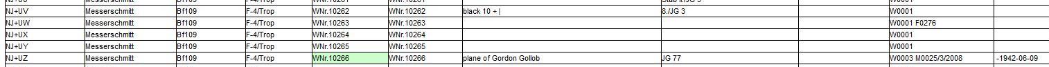 Поищите сами. В качестве подсазки :stkz по Bf 109. Вам, разумеется, известно, что в блоке буквенного кода, как например, NJ+U, последних букв может быть 25 от A до Z латинского алфавита.(Одна из 25) Следовательно, NJ+U - блок с номерами 10241-10266. Потрудитесь проверить, а после я с удовольствием с Вами попикетируюсь и посмеемся... |