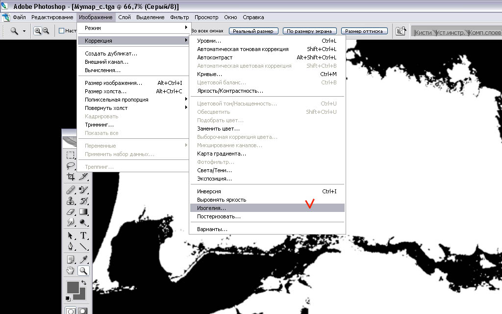 http://forum.aviaskins.com/showthread.php?t=216 и помогали мне все те же люди, которые помогают и тебе. Ну и может не все пока присоединились. Просто я уже прошел этот путь один раз. Итак, по- порядку: Я взял за основу твою карту Мymap_C, открыл ее в Фотошопе. Так как у меня ФШ русскоязычный я приведу все операции на картинках: 1) Я выравнил цвета на карте - черный -0, белый- 255 2) Затем я фильтром -размытие Гаусса добиваюсь смазывания. 3) Тут можно эксперементировать от величины смазывания 0,8-1,3. Я взял пока 1. Все готово. Сохраняем...но пока без рек. Реки я предпочитаю делать по шаблону вручную 2-3 пиксельной кистью ( черный 0). В зависимости от ширины реки. Затем "прогоням" Мymap_C через transform.bat. На выходе получите MWmap_c.tga. Потом дальше MWmap_c.tga. загоняете в disect.bat и на выходе newMWmap_c.tga и MWmap_c.tga_table. Приставки убираете и пользуете уже их как map_c.tga и map_c.tga_table для своей карты. Цитата:
