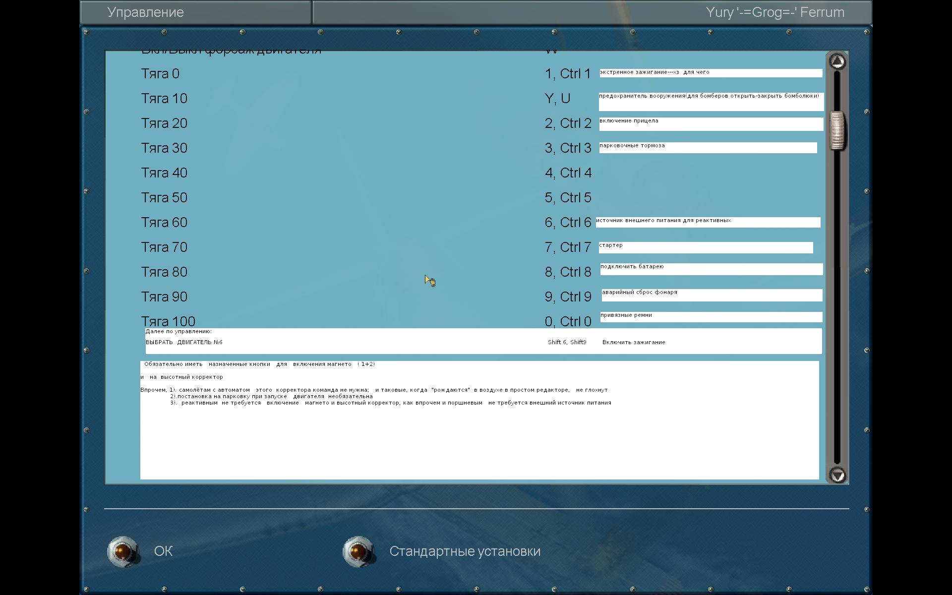 ), все отличие - в упрощенном хистомоде как раз нет Сайдвиндеров. Вечером еще попробую пару вариантов, например, с самым первым хистомодом, или с установкой его самолетов поодиночке. А насчет рекомендаций Петрушке - присоединяюсь! Еще очень бы кстати было поменять соответствие клавиш и команд, все-таки освободить клавиши тяги и назначить вместо них какие-нибудь комбинации с Shift, Alt и Ctrl, если нельзя сделать,чтобы эти команды добавлялись обычным способом - в общий список, с возможностью самому назначить кнопки для них.