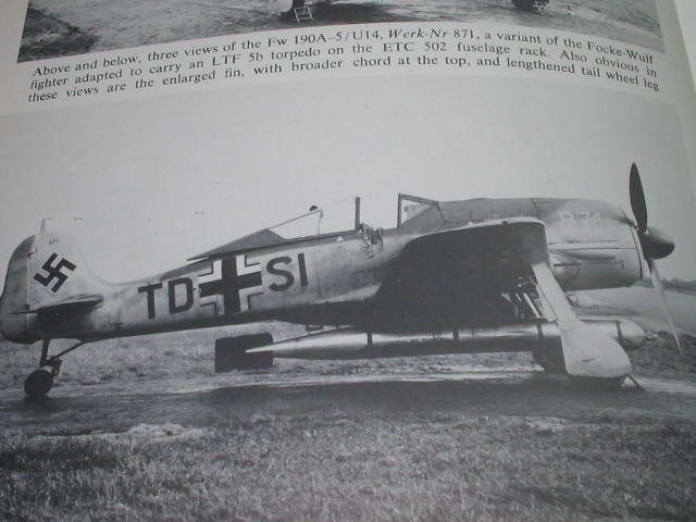 Fw 190A-5/U14 - torpedo plane adopted for transportation of one aerial torpedo LT F 5b mounted on the under-fuselage ETC 502 rack; plane had an enlarged fin (similar to Ta 152) and heightened tail wheel strut to eliminate the possibility ground contact by the torpedo; armament consisted of only 2x1 MG 151/20 E cannons. Two planes were tested TD+SI, W.Nr. 150871 and TD+SJ, W.Nr. 150872. Инфа по кол-ву произведенных: http://www.jg2.org/plane_descriptions/fw190a5.htm (к сожалению сказано, что сделано всего 2 машины )Еще инфа по модификациям фоки: http://www.vectorsite.net/avfw190.html The "FW-190A-5/U14" and "FW-190A-5/U15" were both torpedo-bombers with an extended tailwheel to give ground clearance for the torpedo. There was a similar modification, the "FW-190F-8/R15", for carriage of an odd munition known as the "BT-1400 torpedo bomb". The BT-1400 weighed 1,400 kilograms (3,090 pounds), and looked much more like a bomb than a torpedo, with a long tapered nose, three tailfins (including a folding bottom fin to permit ground clearance), and no propeller. It is unclear if these FW-190 modifications saw much service, though it appears that late in the war the Luftwaffe special-operations group, KG-200, used FW-190s carrying BTs in operations against the Soviets. There are also stories of such long-tailwheel aircraft carrying SC-1800 1,800 kilogram (3,970 pound) bombs, if with great difficulty and stripped of everything that could be removed. They were apparently used to try to destroy the Remagen bridge over the Rhine, seized by the Allies in early 1945. The BT series of munitions were also built in 200 kilogram (440 pound), 400 kilogram (880 pound), and 700 kilogram (1,540 pound) versions. They were unpowered, their shape having been designed to allow the bomb to remain on its drop trajectory even after it entered the water. A special bombsight was fitted to allow the pilot to drop the weapon so that it would shoot underneath a vessel and explode, it seems using a delayed-action fuze. The BT bombs could also be used for attacks on ground targets. Похоже на F8/U2-U3 подвешивалась не совсем торпеда, точнее несамоходная торпедо-бомба BT1400/700. А вот LT F 5b / LT I нормальные торпеды похоже (см. http://de.wikipedia.org/wiki/Deutsch...en_Weltkrieges) Последний раз редактировалось John Fisher; 28.03.2008 в 22:31. |
