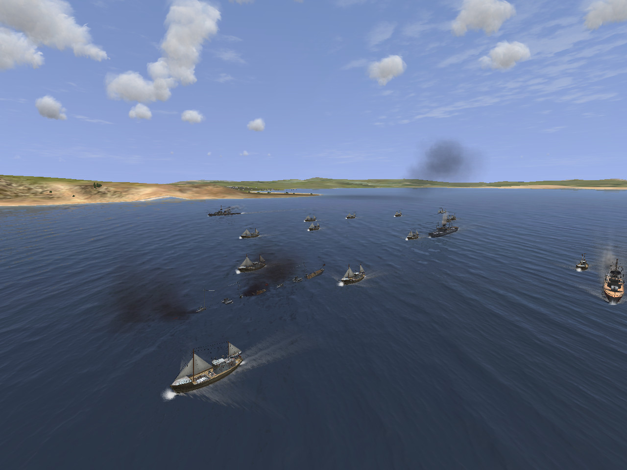 Да,всё-таки горят корабли! Если идут кильватерным строем,то нужно бить головной корабль.Он теряет ход,и происходит следующее-