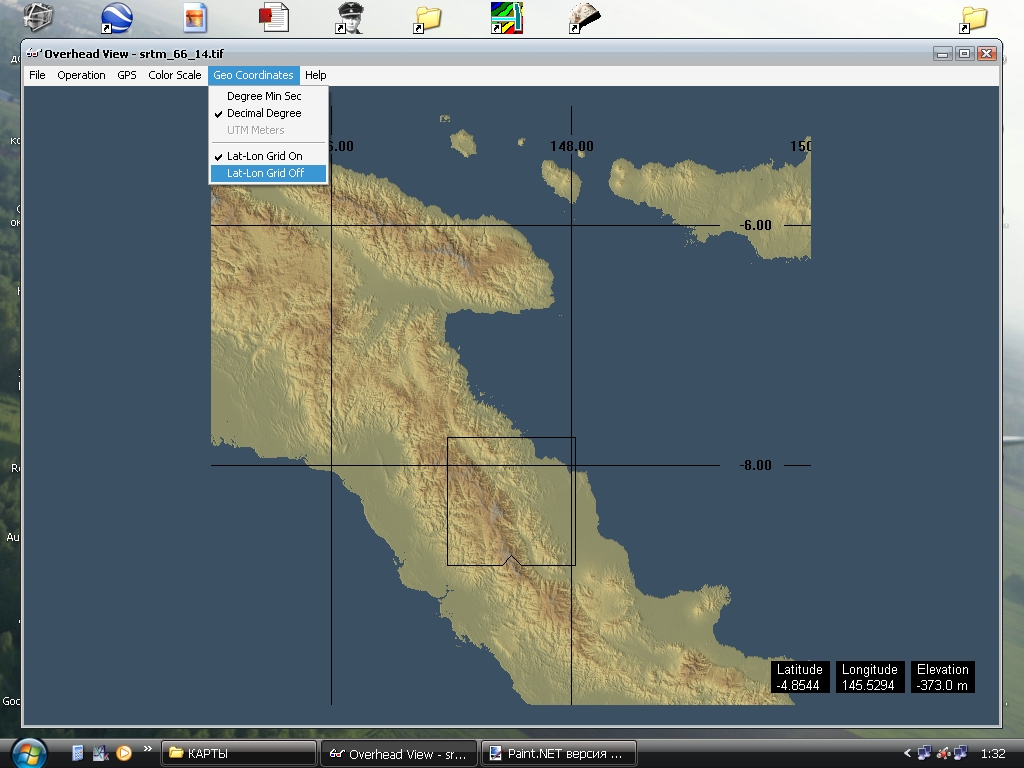 Попробуем работать с Микродем. Note's: программу следует ставить только на системный диск, сохраняя тот путь, который она хочет по умолчанию (C:/Microdem у меня). Для ее функционирования требуется также BDE-пакет, который входит в инсталлятор full-версии - там на странице издателя проги есть разные по весу инсталляторы. Берете самый укомплектованый. Перед запуском программы нам надо кинуть по адресу С:\microdem файл 1 ELEV_COLORS - corrected v7.dbf, который я прикрепил к посту. Пошагово в картинках (если плохо видно - откройте рисунки в новой вкладке) Открываем программу -> жмем кнопку Open DEM ->выбираем наш .tif Несколько секунд программа рассчитывает модель карты и показывает нам ее в стандартном разрешении.