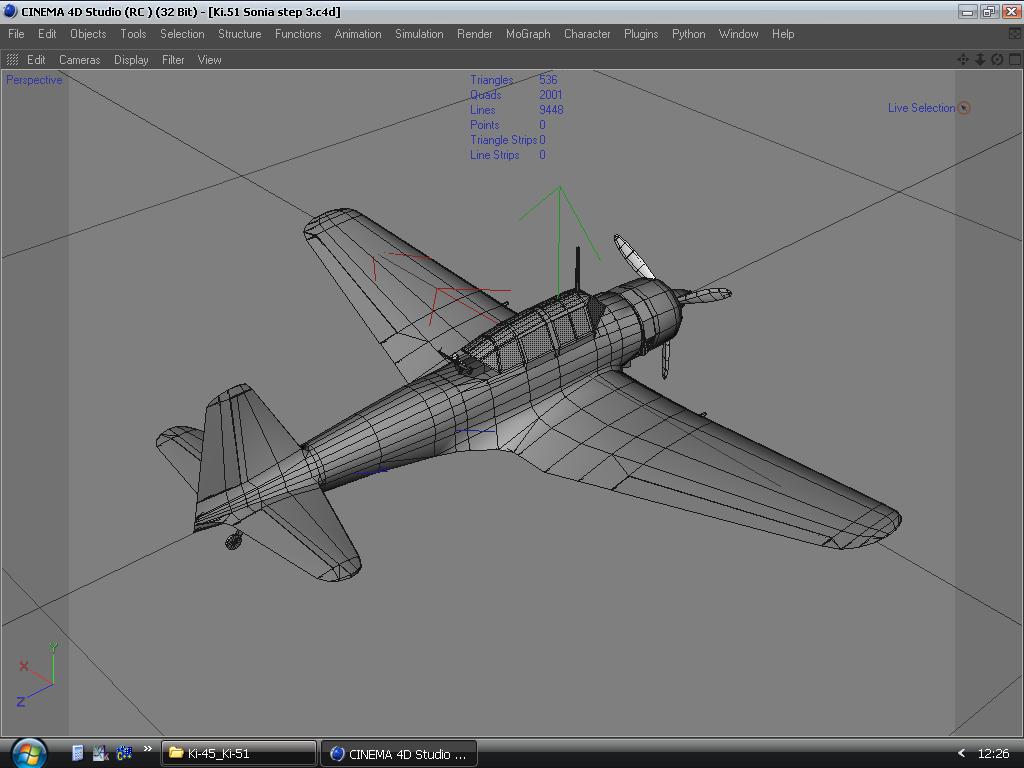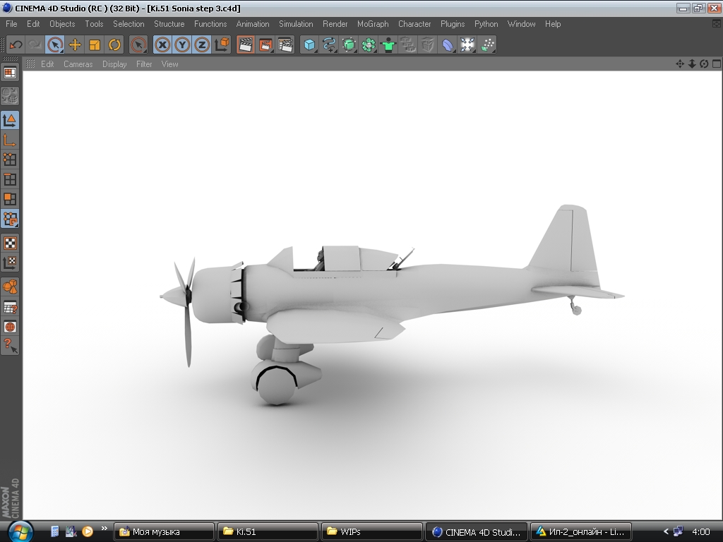 Делая крылья радиатора, обратил внимание на неверно сделаный моторный отсек. Переделываю. Заодно поправил пузо машине. Каждая сворка основного радиатора является независимым объектом с установкой оси Y таким образом, чтобы створка открывалась корректно ("как дверца")