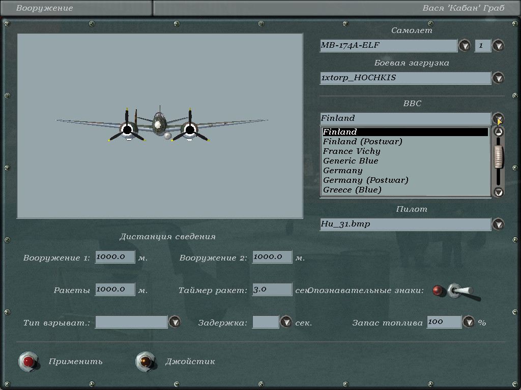 Пришёл к выводу о не соответствиях в вооружении и фм МБ-174., фм взята от Сторера, двигатель Гном-Рон из баттонза САС., чуть-чуть правленный для увеличения скорости полёта на высоте., мощность на номинале 1180лош. сил(в разных источниках варьируеться мощность от 1100-1160 до 1300(на высоте 2400метров)), при ручке до упора - 1300 лошадей. Так же исправлено вооружение в классе(так же поправлены мелкие огрехи в разделе вооружения в плане записи оного) - пушка стоит Хиспано МК-1, а турельный пулемёт МАС39 - за основу взят пулемёт Виккерс, изменена скорострельность. Этот мод не планировал ковырять - только сделал по прозьбе. Управление скоректировано на скорость, поляру не ковырял, поэтому на малых скоростях шарик плывёт влево, но на скорости 90 проц от максималльной должен быть по центру. Мод делан под патч 4.12.2 - в 4.10.1 работать возможно не будет из-за классов оружия от патча 4.12.2.