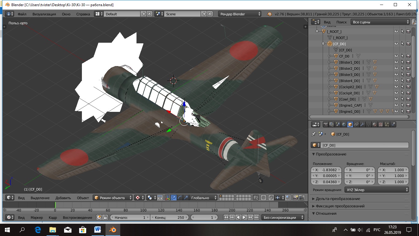 Пожалуй, проще было бы построить модель с нуля, однако острейший недостаток времени не позволяет этого сделать. На что стоит обратить внимание. 1.Во первых большое количество артефактов, предположительно от других моделей. Зачем они здесь, я не знаю, думаю без этих частей модель в Ил-е не появится. Тем не менее удалю всё лишнее, оставлю только нулевой лод. 2. Второе. Некоторые части модели страдают излишней точностью. К примеру колеса или пулемет стрелка наблюдателя. 3. Третье. Не работает модель повреждения от слова совсем. То есть она вроде есть, но нет коллиженов. Буду делать Дамаж-модель заново. 4. Очень хочется сделать анимацию лепестков юбки капота двигателя и подвижных секций кокпита. 5. Вооружение. Цитата из аирвара:"Бомбоотсек предполагал подвеску следующего комплекта бомб: 20х15-кг, 6х50-кг; 3х100-кг или одной 250-кг бомбы. Кроме того на подкрыльевых узлах можно было подвесить еще две 100 кг или четыре 50-кг бомбы. Створки бомбоотсека имели гидравлический привод." То есть нужен внутренний бомбоотсек с распашными створками(они распашные или сдвижные как на Б-24?), замки на крыльях, плюс расширенная номенклатура боеприпасов. Займемся. Если я чего то упустил, прошу высказывать свои пожелания и замечания. На скрине 1. 3д модель Ки-30 с почти удаленными артефактами. |