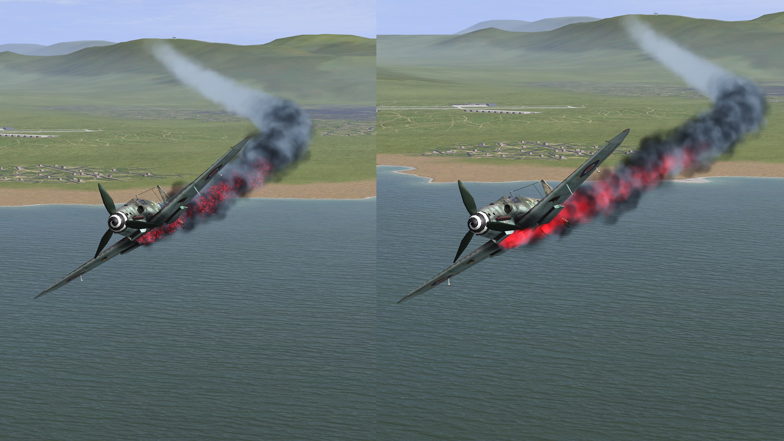 А вот чтобы увидеть это, тебе необходимо сделать запись обстрела например Б-17 и посмотри появление дымоогня в дефаулте и с твоими правками.. Попробуй... Не удержался, сделал скрины из варианта с чёрным дымом и брызгами от движка Як-а и как не крути, а в сравнении с огнём на белом дыме, огонь на чёрном - намнооого зрелищней. И вот уже подумываю: просто сделать из белых дымов чёрный и никакого AircraftState править не надо... Последний раз редактировалось YurBorR; 01.09.2022 в 16:43. |
