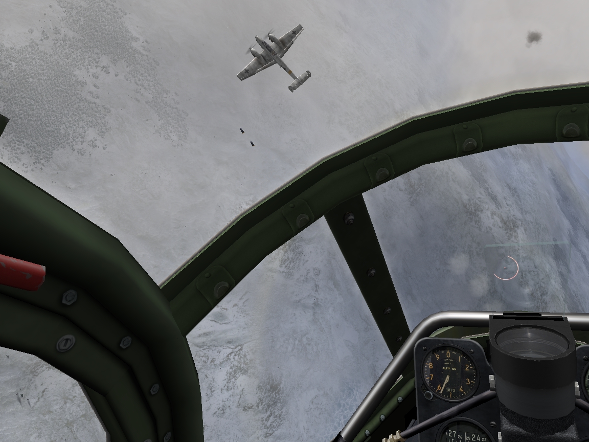 Плюс к тому же «модные» кобры с кокпитами к ним. Карты идентичны, проблем не возникло ( у Андрея, к сожалению старая карта в БАТ) Начну с маленького садизма, а именно с четвертой миссии. Взлетаю по тревоге (без боезапаса). Старт с ангара, сирена тревоги слышна, наземка расставлена хорошо. Погода подобрана для Арктики идеально. Надо мной уже вражеские бомберы, наши «зены» бьют. Взлетаю… а ни справа, ни слева товарищей нет. Мало того 4 «камрада» меня нагло берут в «коробочку». Два сзади, а два в лоб, …а мне и застрелится-то нечем. Трассы сверху, сбоку, снизу (хотя я сам шел на бреющем). После миссии проверил – вся 4-ка асы) 5 минут пришлось энергично «покувыркаться», подставляя фрицев под свои «зены». Слава богу, хоть наши зенитчики оказались на высоте. Только разобрался с фрицами – пришла подмога! … Кстати вражеская бомба действительно попадает в мое стояночное место, как и указано в следующем брифе. |