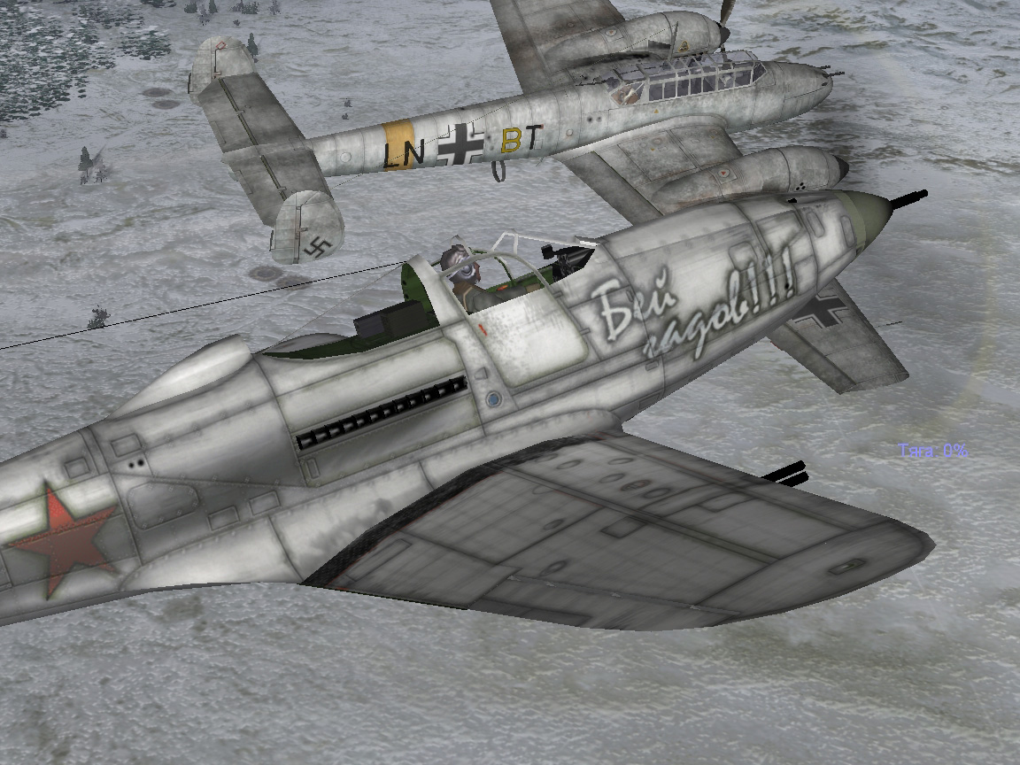 Взлетаю первым, за мной красиво вырулили и взлетели P-40. Нагнал «раму» над Первомайским. Зашел в атаку с превышением ее по высоте метров в 500 и почти на перпендикулярном курсе. Бил по пилотской кабине с упреждением, «рама» энергично уклонялась и хорошо маневрировала. После двух заходов пилот рамы погиб, два члена экипажа выбросились с парашютами. Издалека видна была группа мессеров для моей «отсечки». Задумка автора понятна. Но от встречи с ними уклонился, …сам на «мессеры» не полез. А мои Р-40 также патрулировали в дальнейшем вдоль линии фронта. Боевого соприкосновения не произошло, разошлись мирно. Все сделано добротно. |