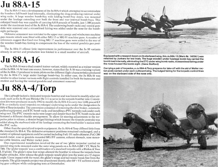 Junkers Ju 88A-17 The last Ju 88A version was based on the Ju 88A-4, and was optimised for the Torpedo Bomber role. It had four ETC racks inboard of the engines replaced by two PUC racks each capable of carrying 1 × 1,686 lb (765 kg) LT F5b torpedo. The forward fuselage was revised to carry a large bulged fairin gon the starboard side which accomodated the gear to adjust the guidance mechanism of the torpedo before release. The crew was reduced to three, and most aircraft had their gondola removed. Number built: unknown out of more than 7.000 Ju 88A's (см. http://www.xs4all.nl/~fbonne/warbird.../junkju88.html) |