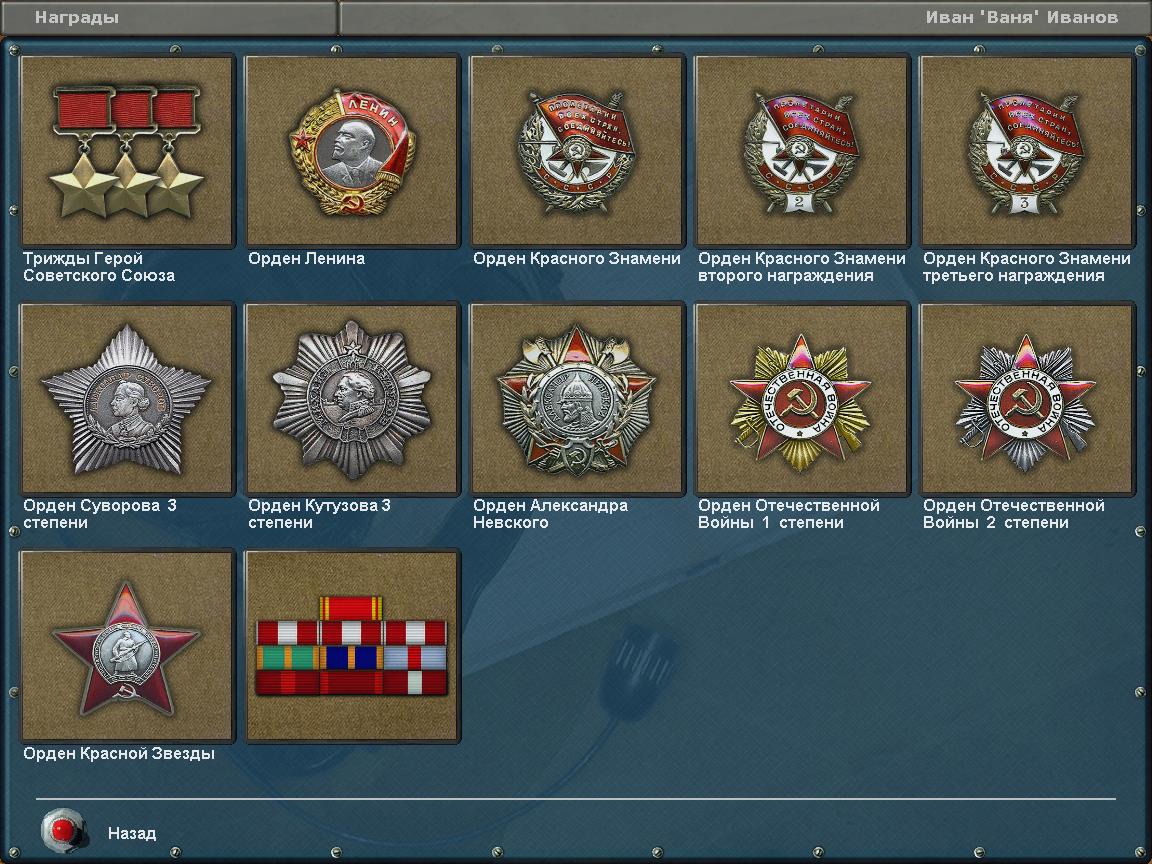0 Орден Красного Знамени 1 Орден Красной Звезды 2 Герой Советского Союза 3 Орден Ленина 4 Орден Красного Знамени 5 Орден Александра Невского 6 Орден Отечественной Войны 2 степени 7 Орден Красного Знамени 8 Орден Отечественной Войны 1 степени 9 Орден Суворова 3 степени 10 Орден Суворова 3 степени В промежутках, по идее должно быть звание дважды ГСС, а как это сделать? Это же в классах? И еще - самих этих наград - орденов Кутузова и Суворова нет в тга. Может, кто-то сделает? Можно и медаль "За отвагу" первой поставить, в начале войны ее давали, да и в последующем - правом на награждение ей обладали командиры полков... Это для обсуждения... |