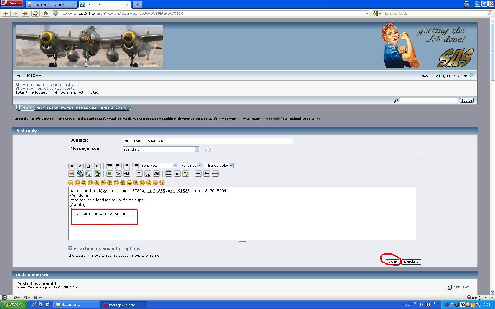 Прозьба к людям кто зарегестрирован на САСе: подскажите пожалуйста как там можно написать пост, у меня не получается, там система замороченная., я там зарегестрирован уже года полтора, но вот припекло написать по поводу некоторых самолётов авторам., обращался за помощью к одному уважаемому человеку тут на нашем сайте(он на САСе так же уважаемый сотрудник), но он не смог в силу ряда причин мне подсказать как там пишут письма. Если будет ваша ласка, кто знает как на САСе вставляют пост, приложите картинку что и куда нажимать. Очень благодарен за подсказку тем кто сможет обЪяснить мне. ///Мой результат чего удалось добится на САСе внизу: картинка. /// И ещё - у кого есть такой(внизу) скин Доры? Поделитесь пожалуйста. /// Сделал фм для Ме-209 с торбовинтовым мотором, но ещё нужно дорабатывать, есть небольшие проблемы по оборотам., буду причёсывать, это пока альфа версия, можете попробовать., плиз, внизу файл: