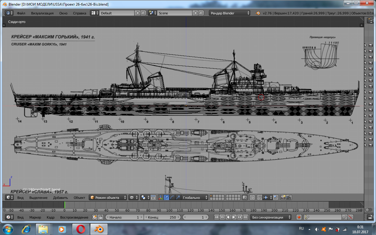 Что то нет желания заниматься американцами... А пока осталось немного свободного времени, решил потихоньку подбирать материалы для окончания черноморской бригады крейсеров. Проще и быстрее "запилить" Червону Украину, на основе Красного Крыма, но хочется чего то для души... Например легкий крейсер Красный Кавказ. Корабль с богатой и нелегкой жизнью, последний из строившихся в царской России кораблей, достроенных уже при советской власти. Флагман Черноморской бригады крейсеров... Когда то давно работа по "Кавказу" уже начиналась и закончилась вместе со старой виндой. С чего начать? Наверно с поиска информации, а с информацией по "Светланам" как всегда проблемы, а с информацией по "Кавказу" двойные проблемы. Нормальных чертежей нет, но у Чернышева есть запись, что "Кавказ" до верхней палубы это тот же "Красный Крым". От этого и отталкиваемся... Из этой ветки скачана старая заготовка "Красного Крыма", которая урезана по верхнюю палубу. В интернете есть хороший чертеж переделанного носа "Кавказа", воспользуемся. А дальше была скачана распечатка бумажной модели "Красный Кавказ" от "Бумажное моделирование №17". Сканы "Бумажного моделирования" были наложены на чертежи, при этом обнаружилось несоответствие чертежей и сканов. Однако решил перекроить модель под бумажную модель, все таки бумажная модель довольно детализирована, кроме того сканы можно попробовать использовать как заготовку под текстуры. Предположительно состояние крейсера будет соответствовать второй половине 1942г. (ремонт и модернизация после Феодосийской десантной операции). И вот очень не спешно моделько начинает собираться. Всем мира.