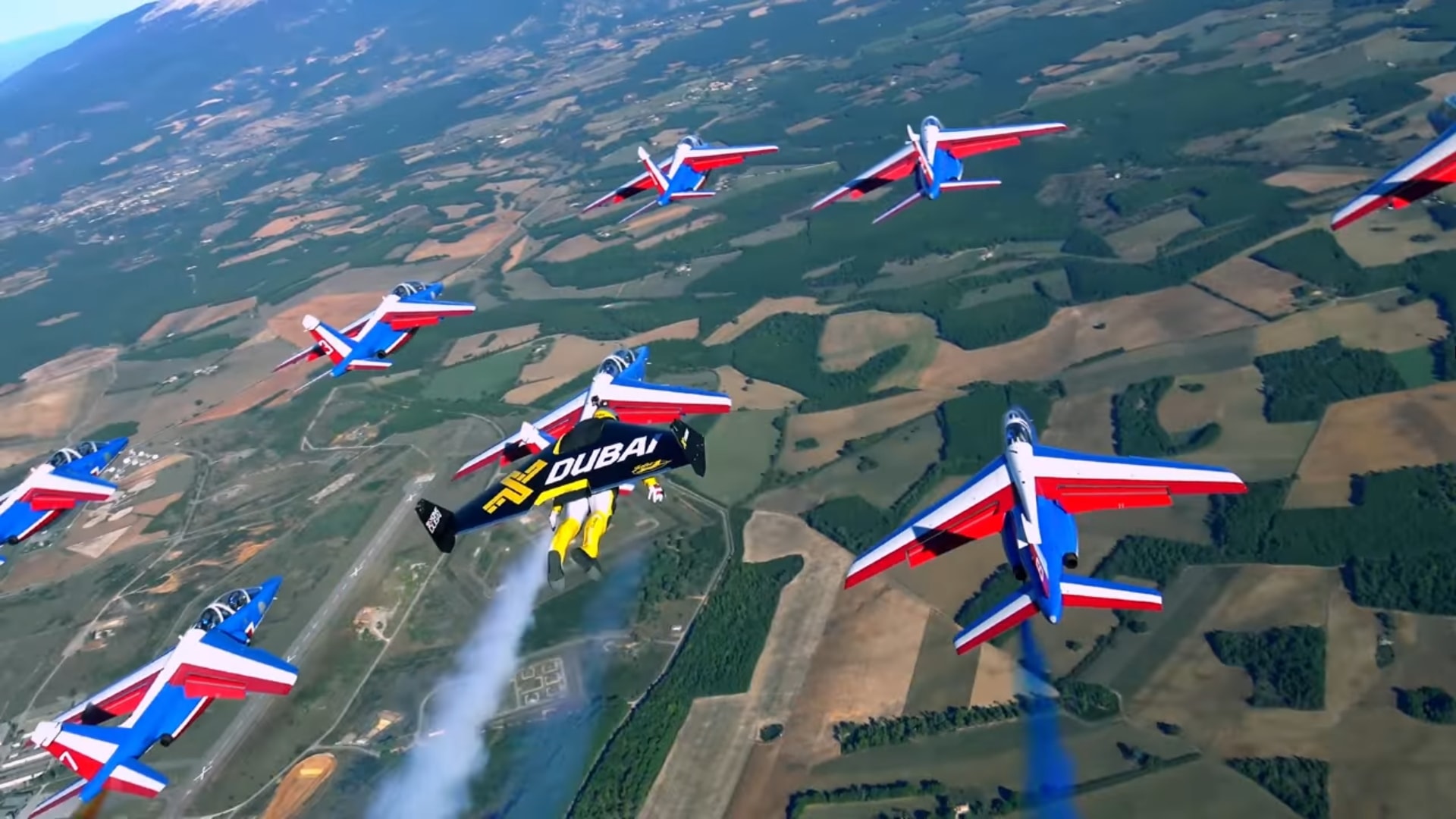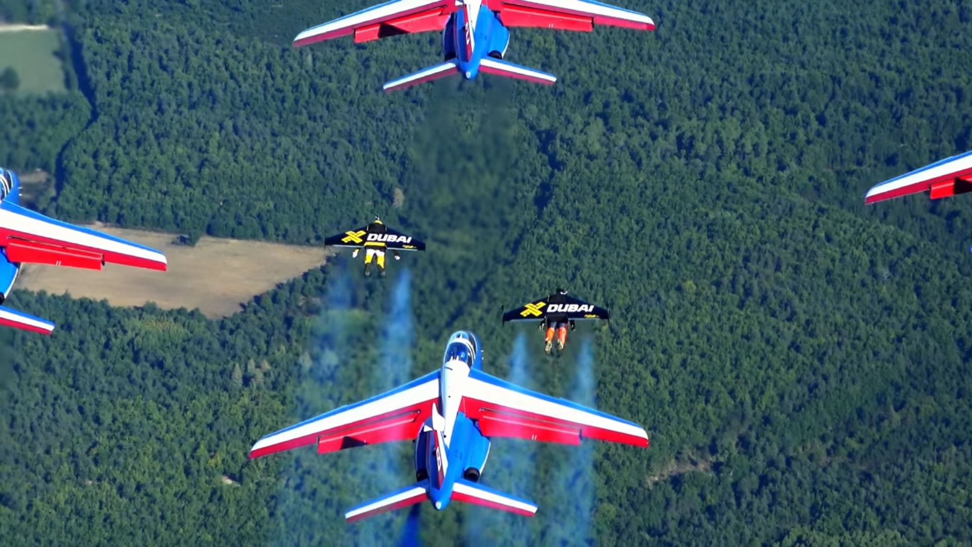 Совместный полёт пилотажников из Патруль де Франс и Джетмэнов |