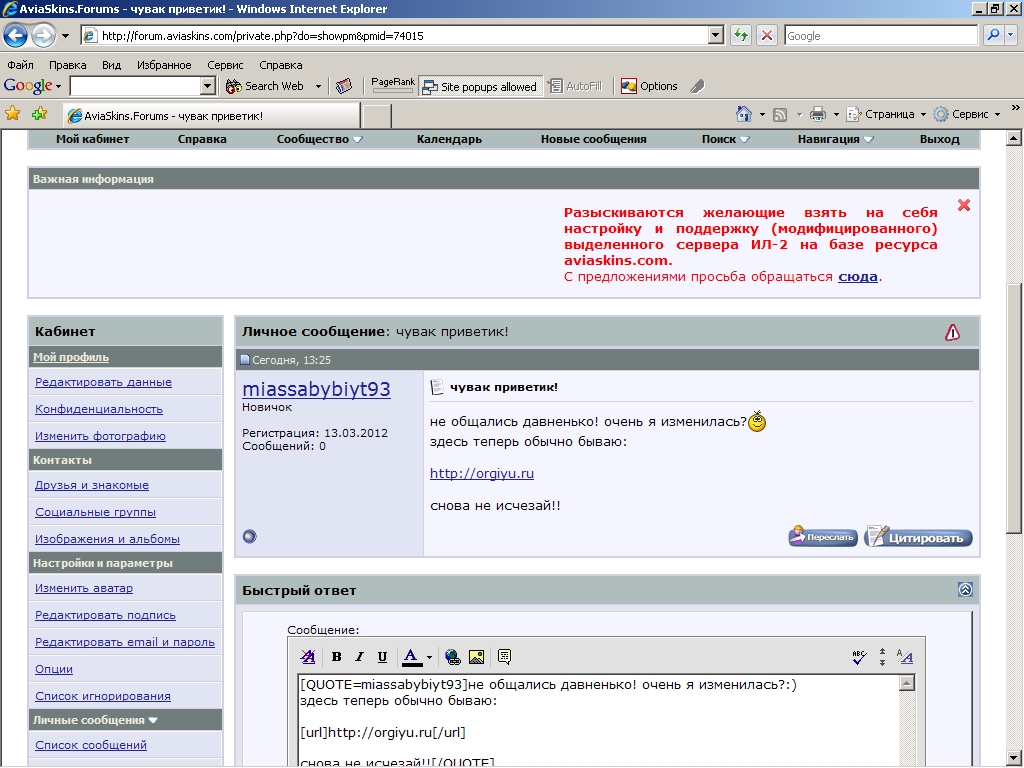 http://forum.aviaskins.com/member.php?u=2662 ---------- от этого пришла таже хрень с "давненько не общались" и ссылкой на какую то херь...