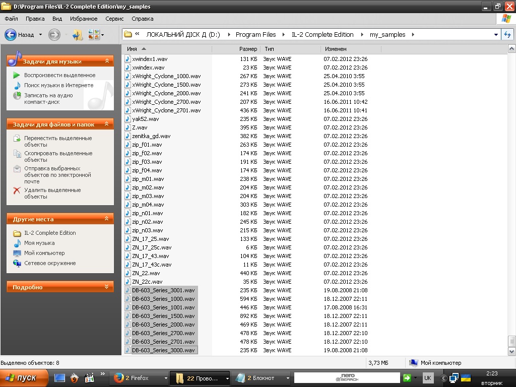 PropName middle StartStopName std_e - просто поставил после двигателя в емд, на который ссылка в фм, но звук то - получается "не родной", хочеться прикрутить звук "автентичный" ДБ-603! Только вот вопрос - как? Если б Виталий был на форуме, может у него бы получилось? Но... Надо, наверное, знать по какому принцыпу ил считывает звуки, может ему нужен необычный формат? Тут уж надо просить помощи Сергея Де Сада в разрешении такой проблемы. Интересно, у других летунов звуки проявляються после установки в паку my_samples? Хочеться таки новые звуки слышать в своих любимых самолётах.